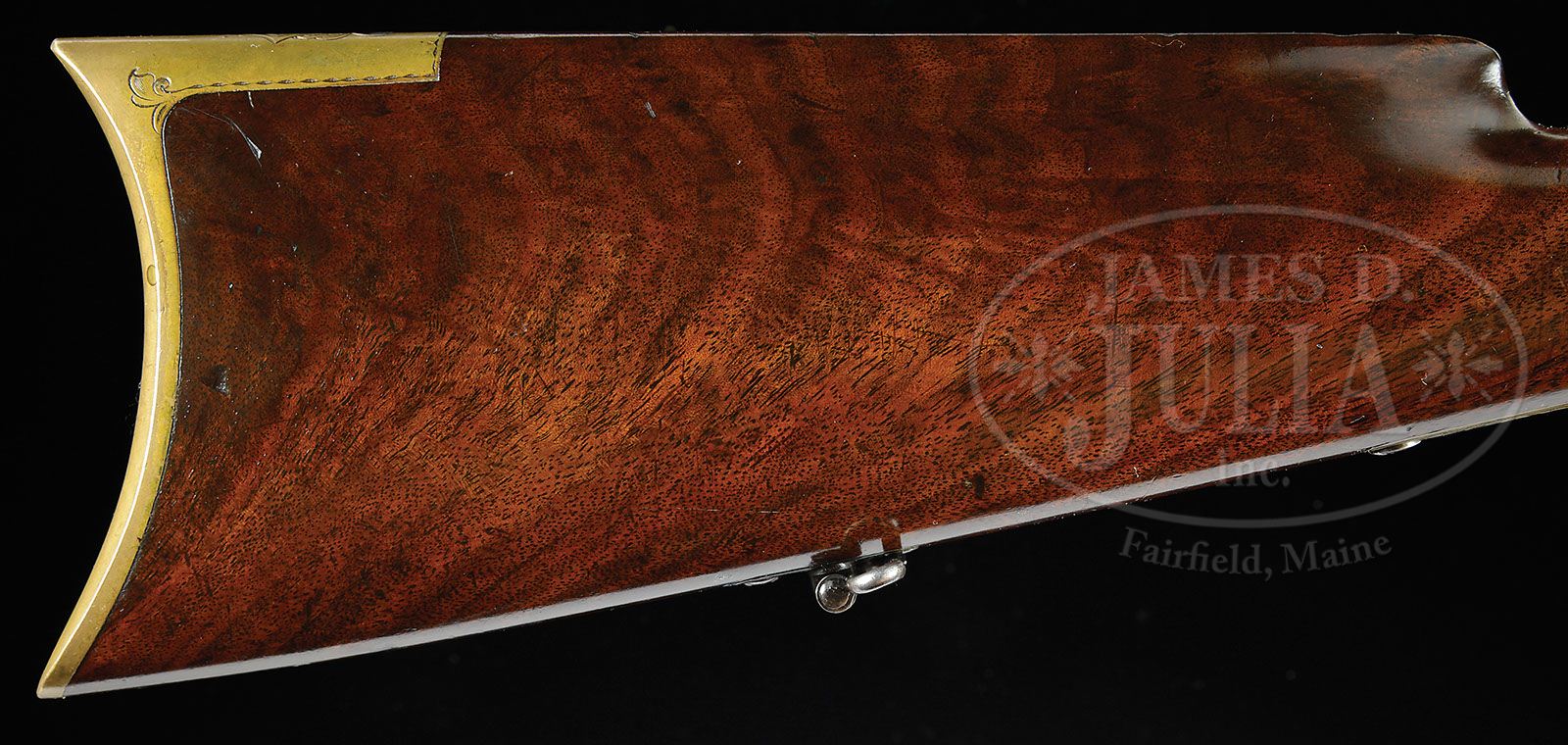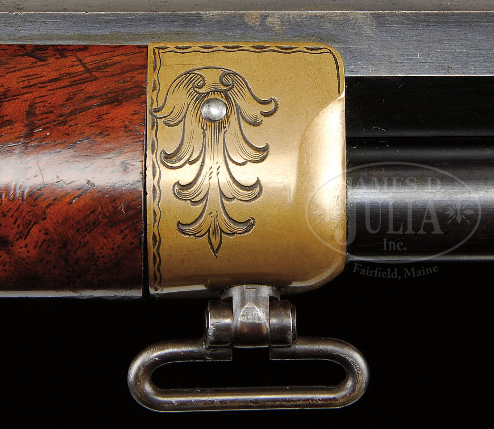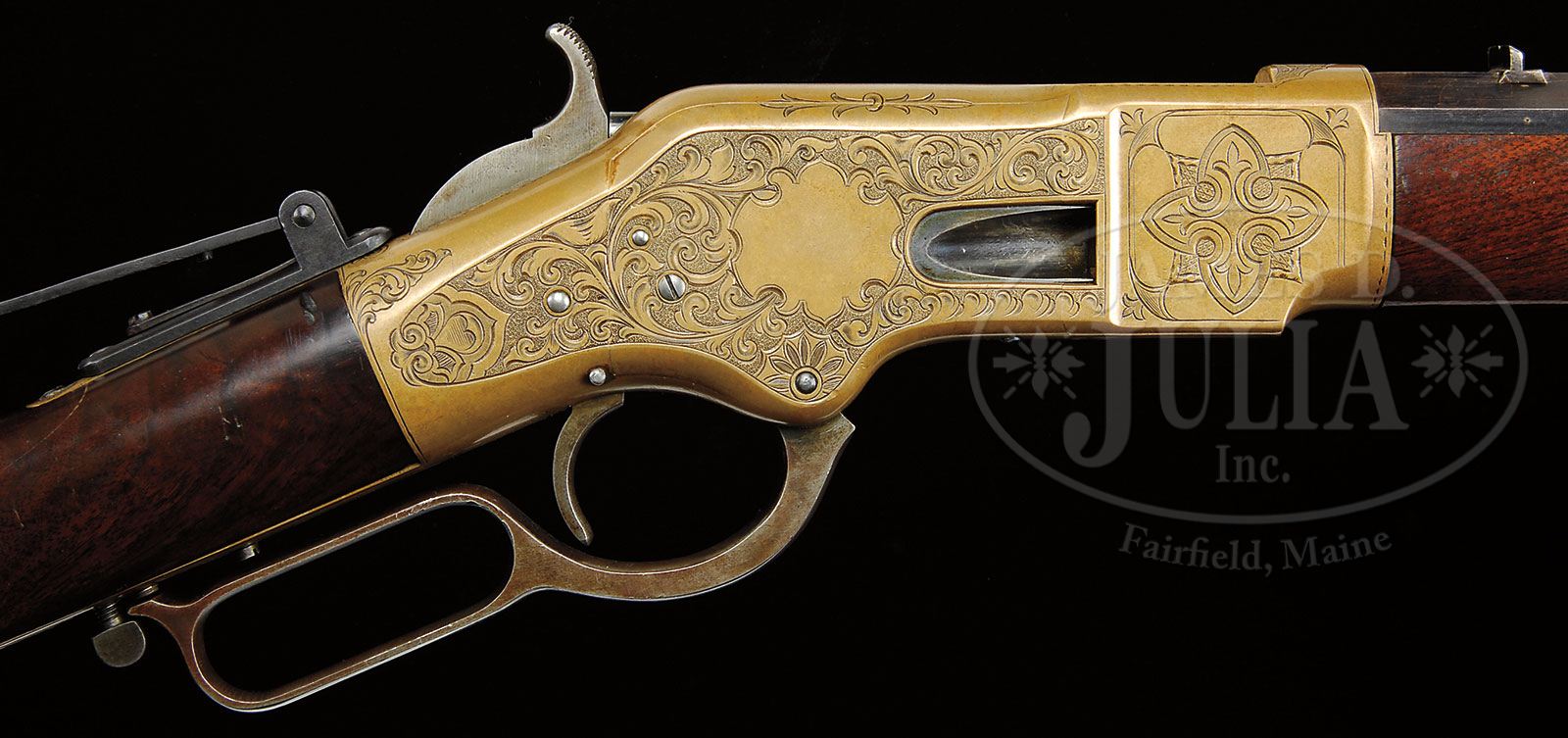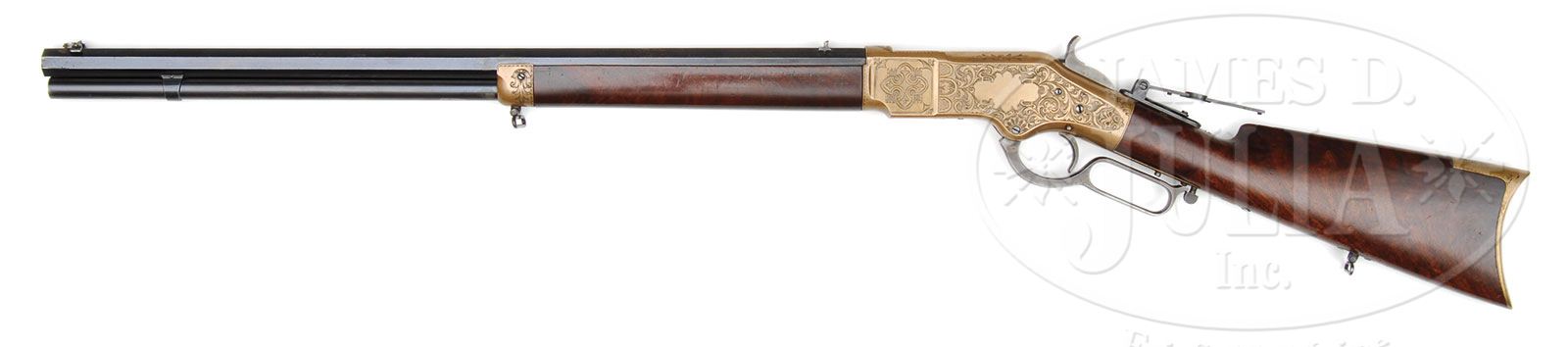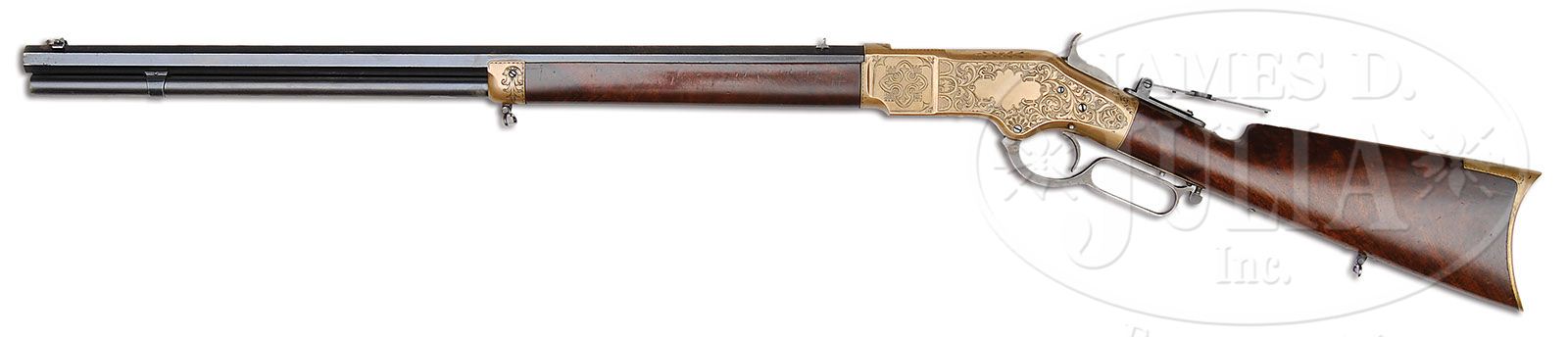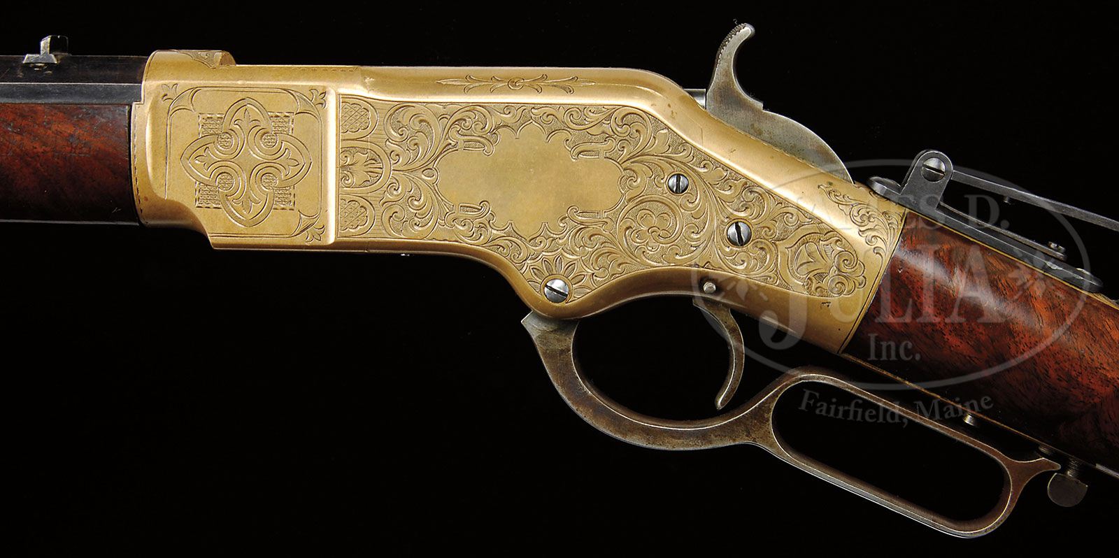 OUTSTANDING DELUXE ENGRAVED WINCHESTER MODEL 1866 LEVER ACTION RIFLE. SN 38058. Cal. 44 RF Henry. Outstanding early rifle with 24-1/4″ oct bbl, full magazine, combination front sight and a replacement fixed rear sight with tang sight that has a 3-3/4″ staff. Mounted with very highly figured flame grain uncheckered American walnut with straight stock and crescent brass buttplate with trap. Bottom of stock has a factory sling swivel with corresponding swivel in the forend cap. Left side of lower tang under the wood is stamped “XX” with large initials “JF”, a “B” and an “O”. Top tang channel of buttstock has last four digits of SN which number is also found inside toe of buttplate. Rifle is engraved by one of the Ulrichs, probably John, with wonderfully detailed foliate arabesque & Moorish patterns on both sides with very fine punch dot background. Top of receiver, top tang, bottom tang and forend cap are also lightly engraved. Bottom of receiver & carrier are engraved with mirror image patterns and buttplate tang is engraved in a geometric pattern. This is a very fine beautiful ’66 with wonderful engraving. PROVENANCE: Wes Adams Estate Collection. CONDITION: Very fine, all matching. Bbl retains 93-95% slightly thinned orig blue with muzzle & sharp edge wear; magazine tube retains about 95% strong orig blue with a thinned spot just above the forend cap which corresponds with a wear spot on the bbl; receiver retains fairly sharp edges showing only light wear and overall the receiver, forend cap & buttplate retain a pleasing medium mustard patina; wood is sound with light nicks & scratches and a few dings on bottom of stock and overall retains most of a very old professionally restored finish. Mechanics are crisp, strong bright bore with moderate pitting. 4-44555 (30,000-50,000)