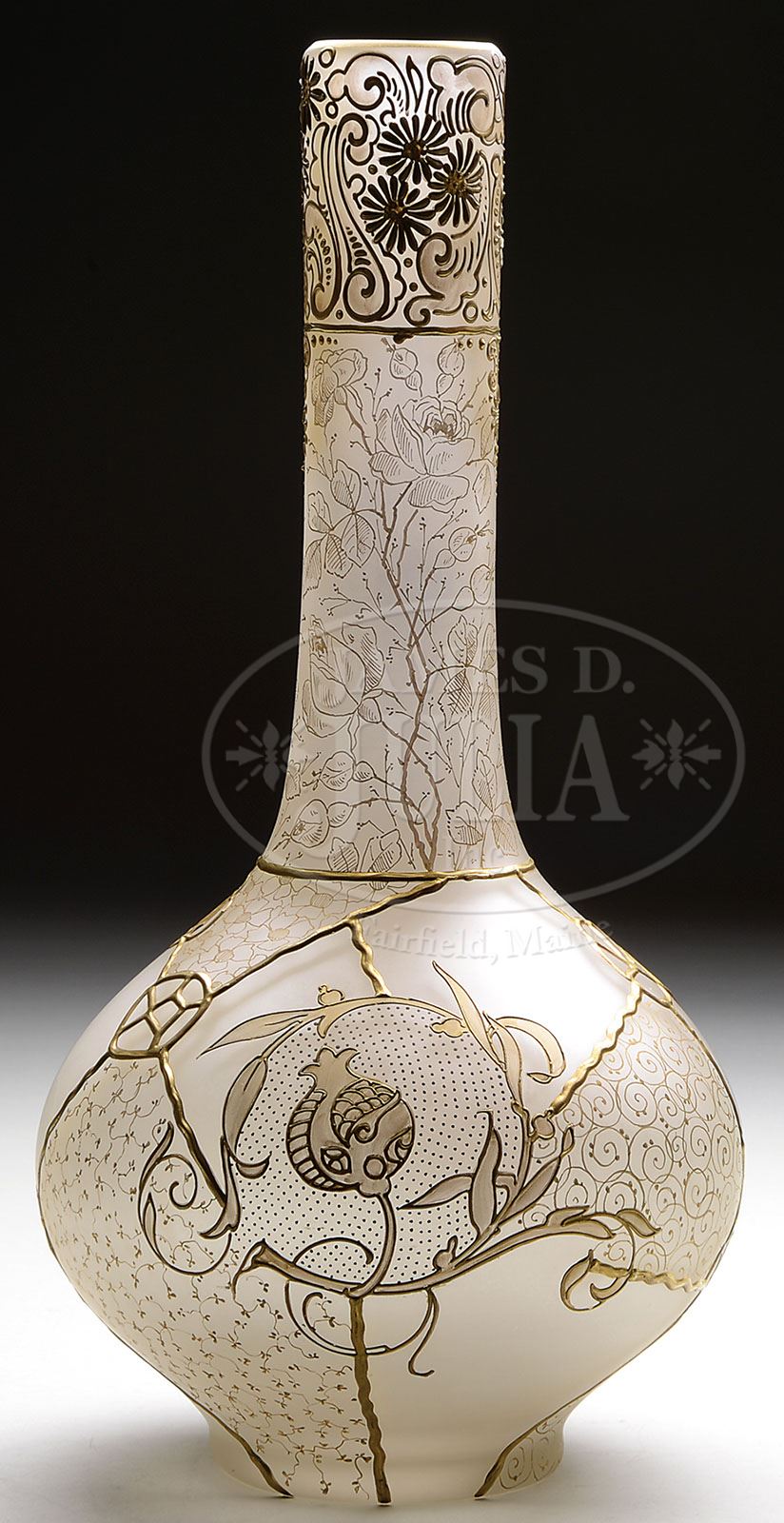 ROYAL FLEMISH VASE. Mt. Washington Royal Flemish vase is beautifully decorated with a gold enameled lion standing about a shield with double headed eagle carrying a large banner. The vase is further decorated on the neck with gold flowers, stems and leaves all set against a frosted background. Signed on the underside “RF” within a diamond and “574”. SIZE: 14-1/2″ t. CONDITION: Very good to excellent. 5-67634 (1,500-2,500)
