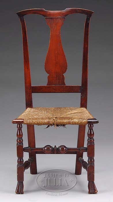 STATE OF MAINE QUEEN ANNE HARDWOOD CHAIR. Second half of the 18th C. Yoked molded flared crestrail above the vasiform splat joined to the trapezoidal woven seat raised on blocked and baluster turned legs joined by a bold bulbous and reeled frontal stretcher on Spanish feet. SIZE: 40″ h to top of back. CONDITION: Chair retains original dark surfaces with good color and patina. Seat original with some frontal weaknesses. 9-91878 (300-600)