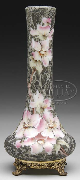 KELVA DECORATED VASE. Bulbous form vase has an elongated neck with a gray mottled ground featuring a pink and cream floral pattern. Vase is supported by a brass pedestal base having four decorative feet. Signed on the underside “Kelva Trade Mark”. SIZE: 9″ t. CONDITION: Very good to excellent. 5-64237 (200-400)