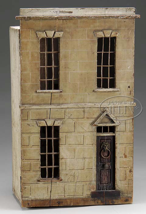 REGENCY DOLL’S HOUSE AND CONTENTS. This little English box back dolls house, circa 1810-1830, has certain characteristics in common with some other early dolls houses attributed to the late 18th century, most notably to Vivien Greene’s “Dower House” and to Flora Gill Jacobs’ “Georgian Town House” with the front door treatment nearly identical to the former, and its general construction and appearance similar to the latter. Retaining its original painted exterior, it depicts a faux limestone facade and retains its original wallpapers, Evans & Cartwright fireplace, carrying handle on the roof, lion’s head door knocker with ring, brass doorknob on the paneled “mahogany” front door, etc. Included is some early 19th century furniture and accessories, and three lovely early Grodnertal dolls. Furnishings include a wonderful English iron half-tester bed with gilt ball finials, two pairs of early Empire style red Saxony chairs, Empire style fruit wood sofa and china cabinet, and a “rosewood” Empire style tilt top center table, and more. Purchased in Boston many years ago purportedly from an old New England collection. SIZE: 28″ h x 17″ w x 12″ d. CONDITION: Some minor cracks to front of house, some overall wear to facade and interior. Overall for its age, very good plus condition. 1-10627 (2,000-3,000) Auction: Advertising, Toy & Doll - Spring 2011 Please Note: All prices include the hammer price plus the buyer’s premium, which is paid by the buyer as part of the purchase price. The prices noted here after the auction are considered unofficial and do not become official until after the 46th day. |