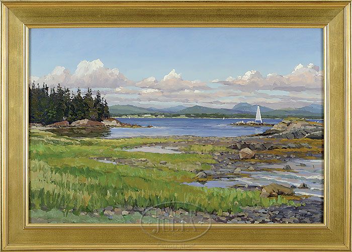 STEFAN PASTUHOV (20th/21st Century) “CAMDEN HILLS FROM OWLS HEAD”. Oil on canvas. Impressionistic marine scene depicting rocky inlet with sea and mountains beyond. Channel marker in mid-ground draws focus to two sailing vessels in distance. Signed “Pastuhov” lower right. Titled on canvas on verso and on labels on frame. Housed in contemporary matte gold frame. SIZE: 24″ X 36″ PROVENANCE: From the “Harp House” of Camden, Maine. CONDITION: Very good to excellent. 9-26946 (500-800)