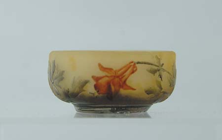 DAUM CAMEO & ENAMEL SALT. Lovely Daum salt has cameo and enameled flowers and leaves against a yellow background, shading to dark brown at the foot. Flowers are enameled in a nice burnt orange color with green leaves and stems. Signed in cameo on the side ” Daum Nancy”. SIZE: 2″ dia. CONDITION: Roughness to one side of foot, appears to be from manufacture, otherwise very good to excellent. 5-68841 (700-1,000)