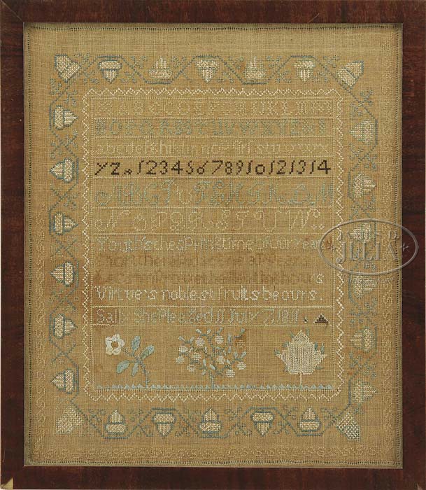 NEW ENGLAND SILK ON LINEN SAMPLER OF SALLY “SHEPLEAFED”, JULY 7, 1811. Wrought with three rows of alphabet in capital and lower case above a line of Arabic numerals in dark brown followed by two rows of the alphabet in script followed by four lines of verse which read “Youth’s the springtime of our years/Short the rapid end appears/Let’s improve the fleeting hours/Virtue’s noblest fruits be ours” stitched in shades of light blue and brown followed by a line stitched with her name and date the quilt was completed. The bottom a pictorial line of a fruit tree flanked by a flower stem and a tree full of birds all within a zigzag border further surrounded by a zigzag and acorn border in blue and cream silk, all within a S-scrolled outer border. SIZE: Sight: 18-3/4″ x 16″. PROVENANCE: From the private collection of Dorothy-Lee Jones. CONDITION: The linen ground with overall staining from acid backing resulting in overall fading of silk threads in tones of brown. 9-23200 (500-800)