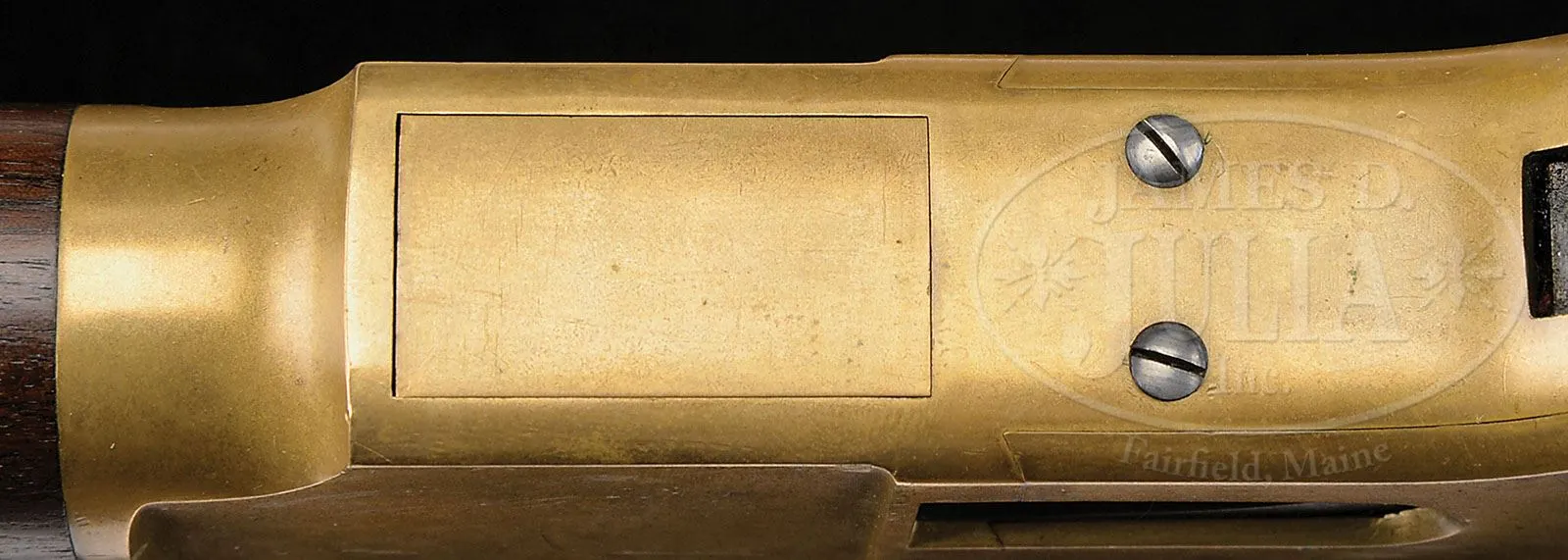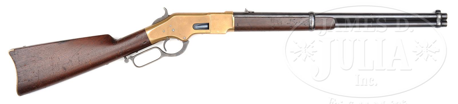 WINCHESTER MODEL 1866 SADDLE RING CARBINE. SN 128275. Cal. 44 RF Henry. Standard grade carbine with 20″ rnd bbl, full magazine, integral front band/front sight & 2 position flip rear sight. Left side of receiver has a staple and ring. Bbl marking is Winchester & Kings patent in 2 lines. Mounted with nicely figured, straight grain, uncheckered, American walnut with straight stock and brass buttplate with trap. Top tang channel of buttstock & inside toe of buttplate are marked with the last 4 digits of matching SN. This carbine was produced in 1876 at the height of the great westward expansion when any repeating cartridge firearm was in great demand, especially carbines for use on horseback. They usually saw hard and continuous service on the frontier, generally under extreme harsh conditions and are rarely found today with high orig finish. PROVENANCE: Woody Frey Collection. CONDITION: Extremely fine, all matching, all orig. Bbl retains 90-92% strong orig blue with some light scratches & thinning over the top. Magazine tube retains most of its orig blue a little dull and turning plum on the outer radius. Front band retains 60-70% glossy, orig blue and the forearm band 75-80%. Receiver is crisp with clean, sharp edges and a couple of minor scratches and overall retains a dark mustard patina. Lever and hammer retain dark case colors, turning a little mottled silver on outer faces of lever. Wood is sound with usual nicks, dings & scratches and retains most of its orig oil finish. Mechanics are crisp, brilliant shiny bore, may be unfired. While this carbine shows a little more handling then another being sold in this auction, it is still one of the finer ’66 saddle ring carbines to come to market in many years, suitable for even the most advanced collector. 4-48405 JR199 (12,500-22,500)