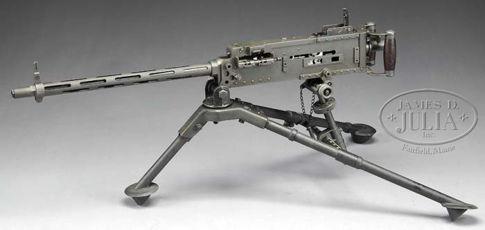 **DLO BROWNING 1919 AIRCRAFT MACHINE GUN (FULLY TRANS). SN 86-70061. Cal. 30-06. 24″ bbl with an overall length of 38.5″. Built on a DLO sideplate. This aircraft version of the famous Browning 1919 design, best resembles the Colt MG40 flexible machine gun in its current configuration. The very light bbl when compared to the standard 1919 ground guns delivered a very fast cyclic rate. Features unique to this design include the slotted bbl shroud and spade grips. This light weight variant was available in both left or right hand feed and this example is set up for left hand feed. Rear sight behind top cover are adjustable for windage and elevation. Front sight, non-adjustable folding post. Includes an M2 tripod including pintle traverse and elevation mechanism. CONDITION: Excellent. Rifling is very sharp and pronounced showing very little wear if any. Mechanism when cycled by hand is very smooth and appears to function correctly. Gun is parkerized in a light gray with some very minor light patina on sideplates. Spade grips have normal dings and dents as typical on period guns. T&E mechanism functions very smooth and fluid and tripod is in outstanding condition. 4-44960 JZ44 (12,500-17,500)