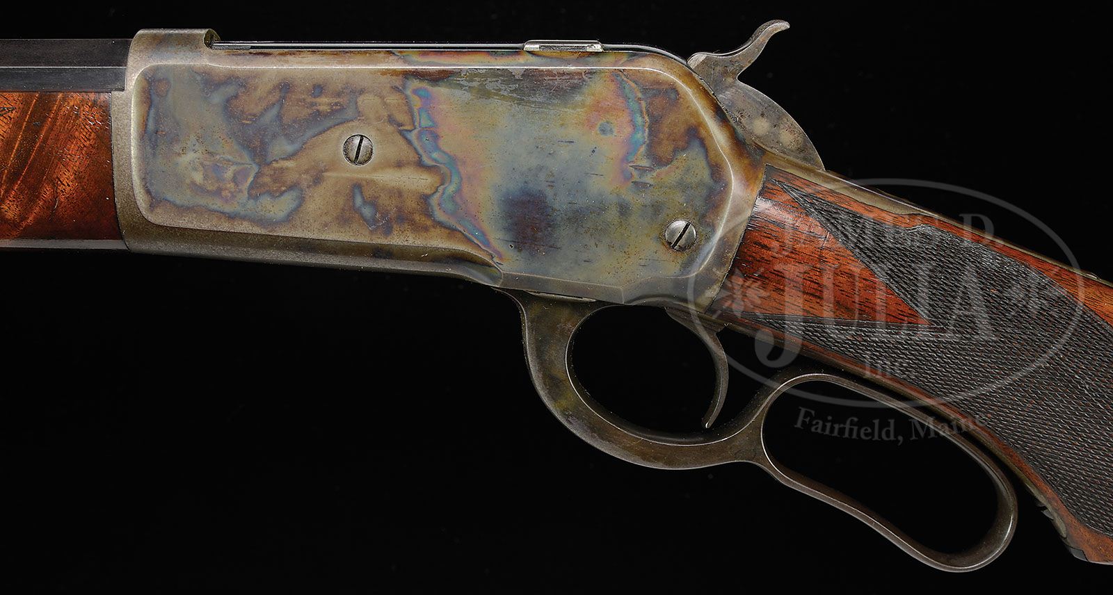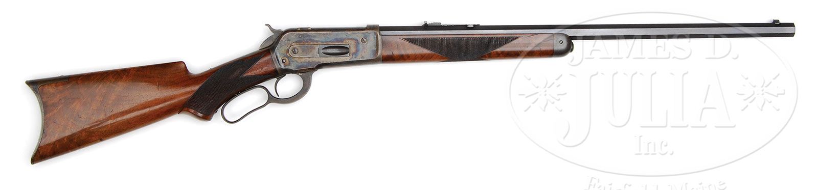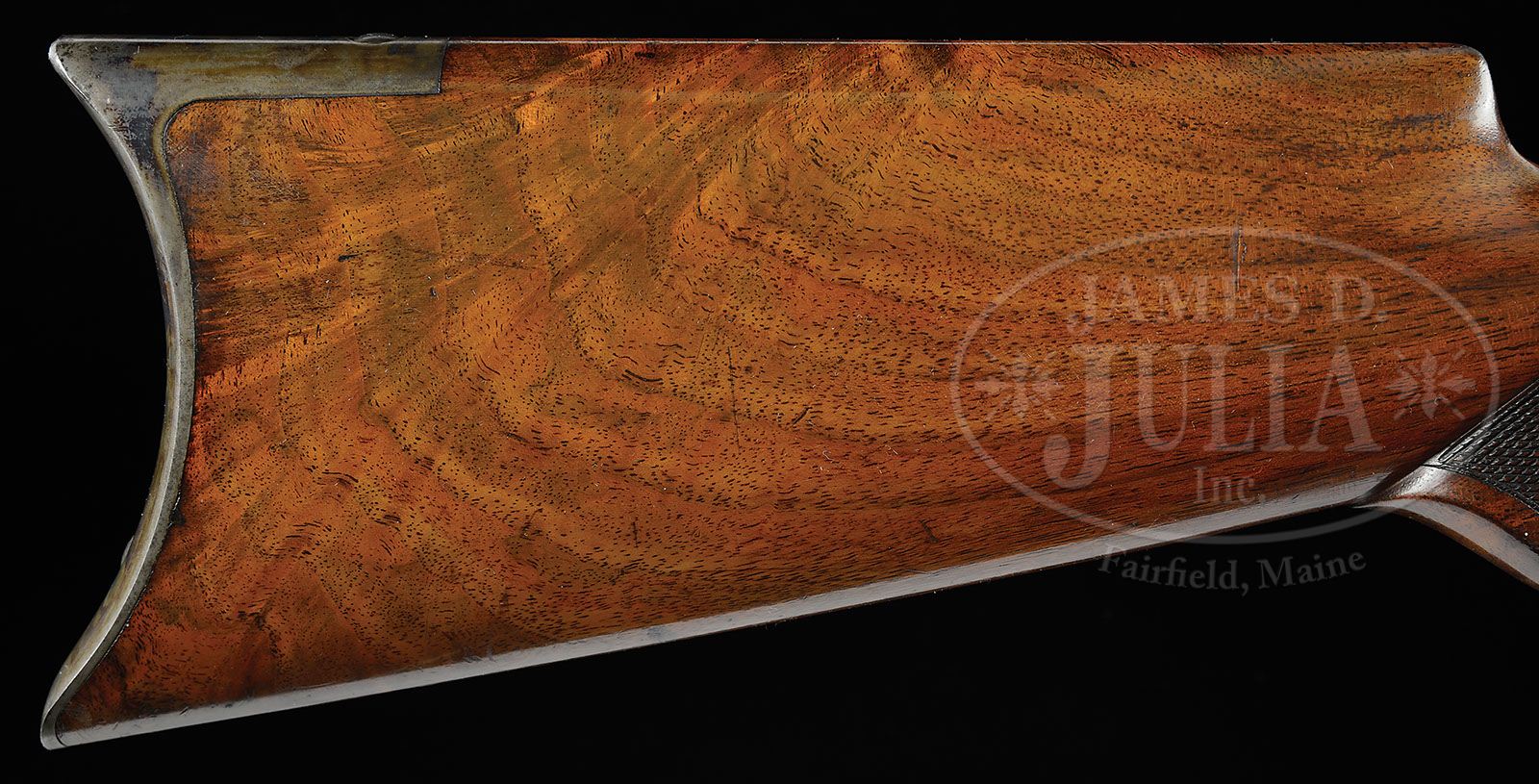 RARE, SPECIAL ORDER DELUXE WINCHESTER MODEL 1886 LEVER ACTION RIFLE. SN 9425. Cal. 38-56. Deluxe ’86 with scarce 24″ oct bbl, button magazine, half nickel front sight and flat top rear sight. Left side of lower tang, under the wood, is marked with assembly number “957” and “XX”. Mounted with very highly figured shell grain American walnut with H-style checkered forearm and serpentine grip buttstock that has black triangle inlay and crescent buttplate. Left side of lower tang, under the wood, is marked with the assembly number “957” and “XX”. Matching assembly number is also found in the top tang channel of the buttstock along with a “P”. Matching assembly number is also found inside the toe of the buttplate. Accompanied by a Cody Firearms Museum letter which identifies this rifle, as found, received in warehouse Oct. 8, 1887 and shipped Oct. 11, 1887 to Order #23809. The bbl length is not mentioned in this letter but all appearances show that it is orig to this rifle. PROVENANCE: Wes Adams Estate Collection. CONDITION: Very fine to extremely fine. Bbl retains 97-98% strong orig blue with only light sharp edge wear; receiver retains most of its orig bright case colors, slightly faded on sides & top, turning silver on bottom; lever & hammer retain strong case colors on sides, moderately faded & turned dark on outer faces; buttplate retains most of its strong orig case colors, lightly to moderately faded. Wood is sound with a few light nicks & scratches and retains most of its orig piano varnish finish. Mechanics are crisp, brilliant shiny bore. This rifle has seen very little use, if any. The bolt face & loading gate show no evidence of having been used. 4-44482 JR27 (15,000-25,000)
