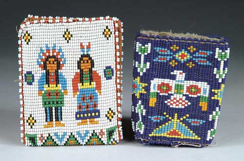 TWO INDIAN TRADE BEAD PIECES. Beaded leather wallet with Indian motif and an Indian beaded cigarette pack holder with eagle. SIZE: 4” x 3-1/2”. CONDITION: Generally good. 9-98517 (150-250)