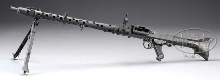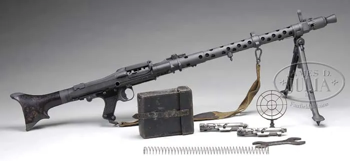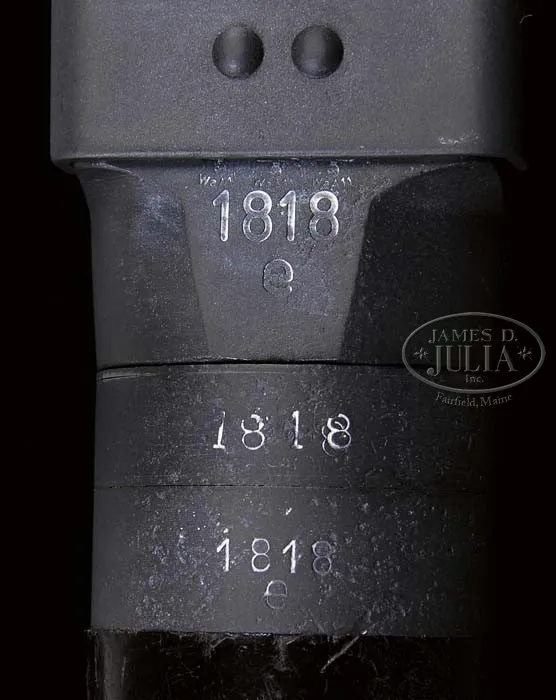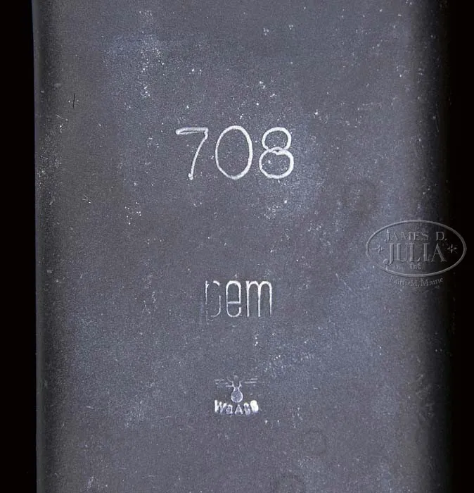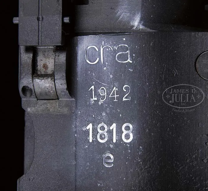 ***GERMAN MG-34 MACHINE GUN MADE BY MAGET (PRE-86 DEALER SAMPLE). SN 1818 E. Cal. 8mm Mauser. 24-1/2″ bbl. Manufactured by “cra” (Maget), 1942. Includes two spare bolts (one missing rollers on one side), spare mainspring, web sling, one orig and one post-war non-disintegrating belt, one leather gunner’s tool pouch with anti-aircraft sight, spanner for muzzle, tin oil can and bbl retracting tool. Gun matches in SN on bbl shroud, receiver and buttstock mounting hardware, although buttstock is un-numbered on the hard bakelite, but this is an early buttstock with reinforced metal tips on the heel and toe. Pistol grip is likewise matching in number to the gun, as is the charging handle, although charging handle is marked “S/243″(Mauser). Bipod is of early type with leg adjustment knob dated 1940 and marked “936” with “WaA4”. Bbl shroud marked “BNZ” (Steyr), on perforated portion; top cover marked “708/pem waa66”. Muzzle booster is missing the booster cup inside. Feed tray is un-numbered, but marked “cof” (Grossfus) and includes small tab on right side to keep belt from falling out. This weapon appears fully functional, except for missing booster cup which is a common part to find. Firing mechanism operates correctly when cycled by hand. One of the spare bolts is marked “WaA11”, which would match in manufacture to this gun, although none of the SN on the bolts match the gun. CONDITION: Overall finish and appearance in 100% gray phosphate blue refinish over parts which show pits from old corrosion on shroud, receiver, and buttstock hardware. Pistol grip and top cover appear much smoother, as does bipod. Bore is shiny and bright on Nazi proof marked bbl, not matching in SN to gun. Receiver cams and shroud cams are in excellent condition, no evidence that this gun has been fired since its refinish. Overall appearance is quite attractive in its gray finish. Would make a welcome addition to any German machine gun collection. 4-40510 JWK3 (7,000-10,000)