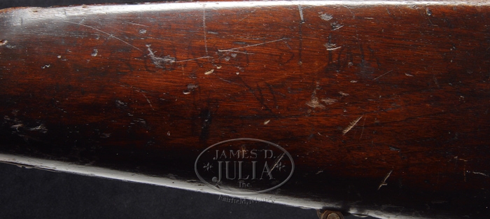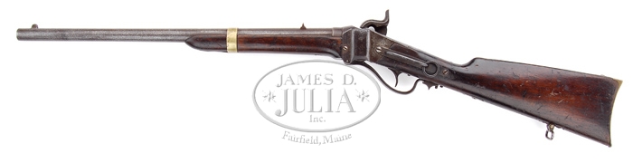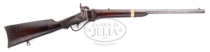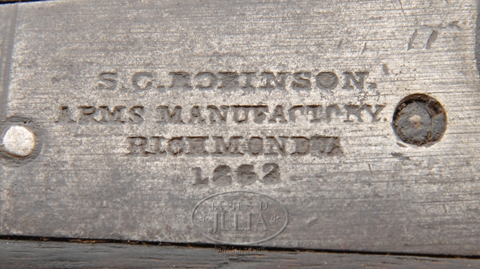 S. C. ROBINSON CONFEDERATE SHARPS. SN 2468. Cal. 52. This fabulous, historic carbine, identified by inscription on the stock to a member of “Stuart’s Cavalry”. Also written on the side of the stock “MOBILE, ALABAMA”. Stuart’s Cavalry was one of the hardest fighting calvary units in the Civil War and Lee had come to rely so much on Stuart’s elite and fleet ability that his absence during the onset of the Battle of Gettysburg was a tremendous loss to Lee and in his mind, in part, resulted in the defeat at this monumental battle for the South. This is a nice, orig and complete example of the earliest made Confederate Sharps carbines. SN appears externally on lock and frame. Lock is marked “SC Robinson / Arms Manufactory / Richmond Va / 1862” and bbl is marked behind rear sight “Richmond Va / 1862”. Initials “LSK” are nicely carved in buttstock. A search of Confederate records reveals an L.S.King who enlisted 7/31/1862 as a Private in Co G Va 4th Cavalry of Jeb Stuart’s division. Mr. Michel, in his notes, offers the following information: “Manufacture of the Sharps pattern carbine by the S. C. Robinson Arms Manufactory from Dec. 1862 to March 1, 1863, when the carbine factory was taken over by the Confederate government. during this short period, close to 2,000 carbines were produced. While these carbines generally follow the outline of the actual Sharps, the difference is immediately noticeable as the lockplate is not drilled for the Lawrence primer feeder and the hammer is more narrow and not imbedded into the outer projection of the receiver. The lockplate is marked ‘S.C. Robinson / Arms Manufactory / Richmond Va / 1862’. The top surface of the barrel is stamped ‘S. C. Robinson / Arms Manufactory’, and behind the rear sight is stamped ‘Richmond Va / 1862’. The serial number appears at the tail of the lockplate. This is the highest serial number known for a Robinson-marked carbine”. You are bidding on a popular Confederate carbine that generally saw a lot of use, and though this gun was used in battle, it is generally well preserved and complete. CONDITION: Bbl is brown/gray with scattered pitting. Other metal surfaces are also brown/gray with scattered pitting. Rifling in bore is deep and distinct, though pitted. Brass band has been cleaned. Brass buttplate is smooth and exhibits nice patina. Buttstock exhibits some orig varnish with numerous small nicks, dings, and scratches. Forestock has 3″ hairline crack which does not affect aesthetics. 4-31342 JS132 (20,000-40,000)