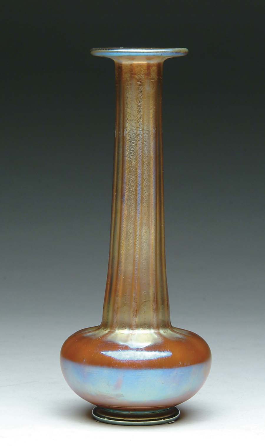 TIFFANY BUD VASE. Tiffany bud vase features iridescent gold coloring with blue highlights and vertical ribbing. Signed on underside “LC Tiffany Favrile 9332N 1834”. SIZE: 8-1/2 in. t. CONDITION: Very good to excellent. 5-60813 (900-1,200)