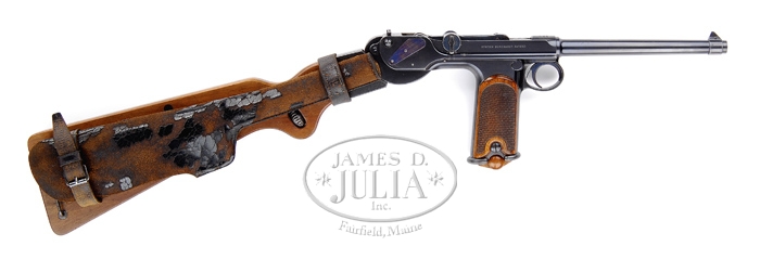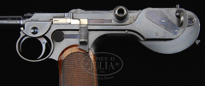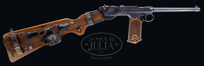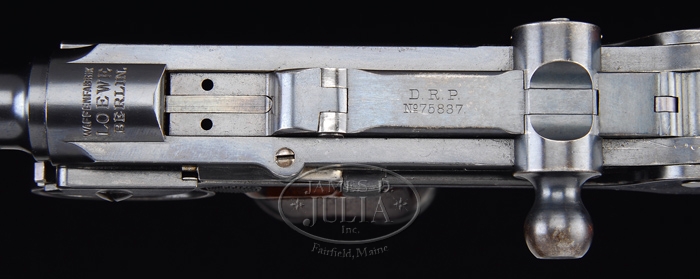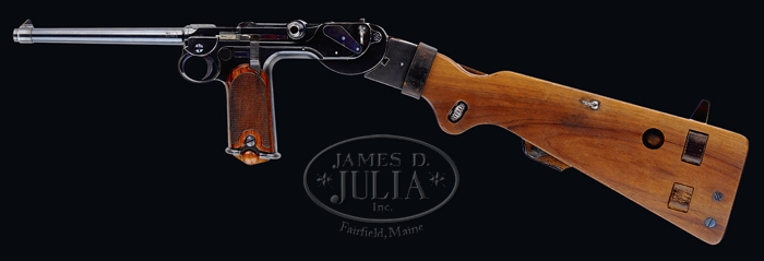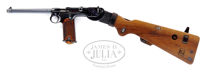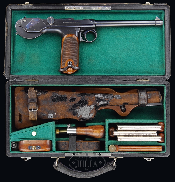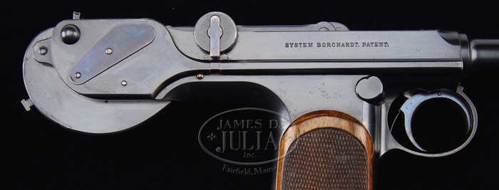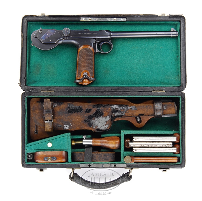 *BORCHARDT PATENT MODEL 1893 SEMI-AUTOMATIC PISTOL #19. SN 19. Cal. 7.65. All blued finish with a 7-1/2″ bbl and 2-piece wooden checkered grip. Most all parts are marked “19”, except cheekpiece. Chamber marked “Waffenfabrik Loewe, Berlin”; toggle marked “D.R.P. No. 75837”; right side of frame marked “System Borchardt.Patent.” with numerous German proofs on left side of chamber and bbl. Pistol comes complete in carry case with accessories, shoulder stock with attached leather holster, four matching magazines, a dummy magazine with an intracal brass oiler, a cleaning rod with tips, a leather shoulder strap, a small oil can marked “Made in USA”, a wooden cheekpiece for the shoulder strap with a brass plunger knob, two flat metal screwdrivers; all parts except cheekpiece is marked “19”. Cheekpiece numbered “351”. Carrying case is covered with black leather and has a covered carrying handle with nickel plated hardware. Case is lined in green vaize. Back of dummy clip is marked “GESETZLICH GESCHUTZT” as is the bottom of the stock. PROVENANCE: Stern Collection. CONDITION: Pistol retains 98% of its orig blue finish with nitride blue on the trigger, springs and plates. It shows very little wear and has just a little bit of finish corrosion on the grip straps, top of toggle and toggle knob with a very slight amount of finish wear on the front sight ring. Grips are in excellent condition with no dents or bruising at all and very sharp checkering. Grip screws retain nearly all of their blue and just one slight bugger on the left. Nickel plated magazines are in very good condition with a little light pitting into the nickel and numbered wooden bottoms remain flawless. Dummy magazine with brass oiler is in excellent condition as are the cheekpiece, screwdriver and all of the other accessories. Buttstock also shows excellent plus, retaining almost all of the blue on the metal with just a minimal of corrosion and a couple of very minor scuffs. Holster is soft and pliable but shiny black dye leather has all but flaked off. Leather shoulder strap is soft and pliable but showing its age with some cracking. Leather covered case, with the small flat that reads “J.L. Childs, Floral Park, L.I.” shows very good with some nicking throughout. Leather case handle is pretty dry but shows no tearing at this point. Action is crisp and clean and bore is bright and shiny. One would go far and wide to find a better or more complete Borchardt than this. 4-33902 BK130 (30,000-40,000)
