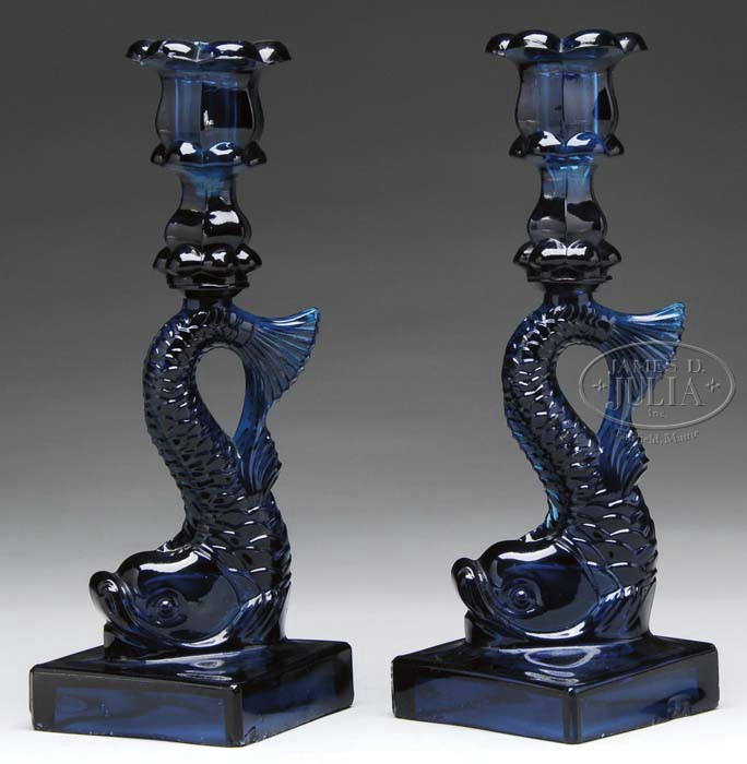 PAIR OF DOLPHIN CANDLESTICKS. Single step base dolphin candlesticks of a wonderful teal blue color are made in two parts with the socket being attached to the dolphin’s tail with a wafer. Bases have been factory polished to sit level. See Barlow & Kaiser Vol. 4, pages 64-69 for reference. SIZE: 10-1/2″ t. PROVENANCE: From the Private Collection of Dorothy Lee Jones. CONDITION: Stick A, there is a large spall off one petal of socket and several smaller flakes. Base has numerous tiny chips and flakes and one small line at the corner. Stick B has one medium size spall chip on one of the petals of the socket and a flake off the tip of the dolphin’s tail. Base has numerous tiny chips and spall marks. 5-61751 (600-1,000)