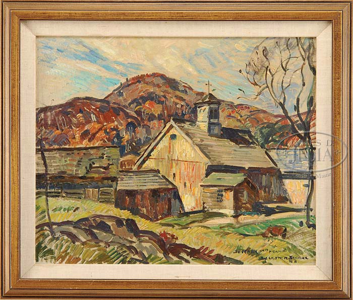 WILLIAM LESTER STEVENS (American, 1888-1969) “CONWAY BARN”. Oil on canvas western Massachusetts scene shows a connected large barn with cupola and weathervane. A series of hills are seen in background under blue and white cloud sky. Inscribed on front “To Mary and Frank – W Lester Stevens N.A.”. Housed in a wood frame with linen liner. SIZE: 18-1/2″ x 22-1/2″. CONDITION: Very good. 9-98051 (3,000-5,000)