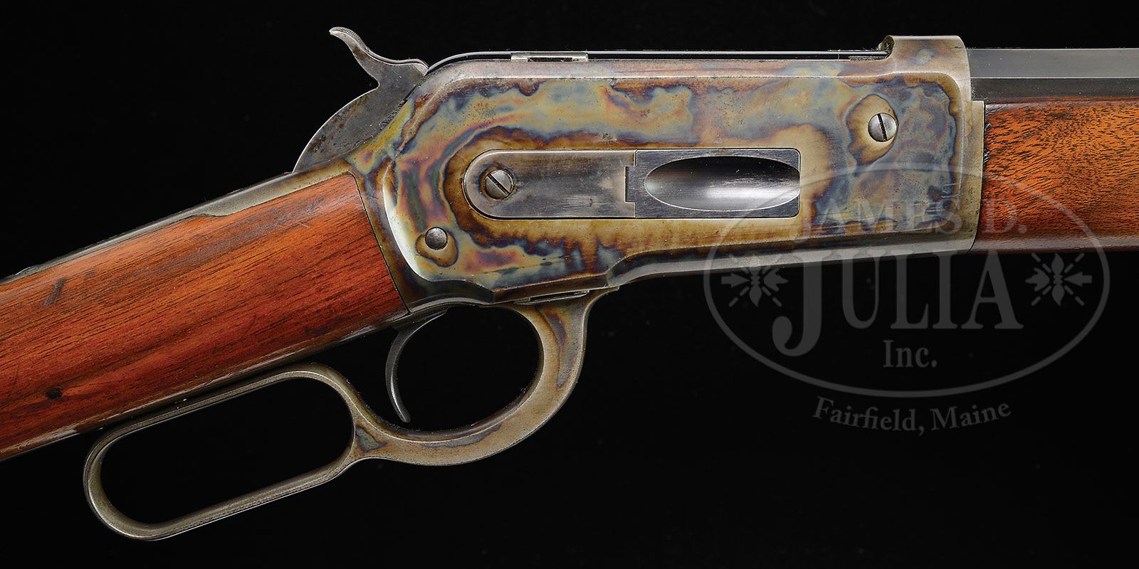 EXTREMELY RARE ONE OF A KIND WINCHESTER MODEL 1886 LEVER ACTION RIFLE. SN 26582. Cal. 40-95 (Yes, that’s what the record states.) Standard grade rifle with 26″ oct bbl, full magazine, half nickel front sight and semi-buckhorn rear sight. Top flat of bbl has the standard Winchester roll marking with the caliber “40 EX” over the chamber area. Mounted with nicely figured, uncheckered, slab-sawed American walnut with straight stock & crescent buttplate. Accompanied by a Cody Firearms Museum letter which identifies this rifle in caliber 40-95 “(as per record)”, with oct bbl & plain trigger, received in warehouse Nov. 12, 1888 and shipped Nov. 19, 1888 to Order #15431; repair & return March 16, 1891. Also accompanied by a copy of the shipping record for this rifle which also indicates caliber 40-95. Additionally accompanied by a copy of p. 69 from an unknown publication which shows two charts, one for bbl length and the other for calibers. This chart indicates that there was only one rifle produced in caliber 40-95. PROVENANCE: Wes Adams Estate Collection. CONDITION: Very fine plus. Bbl & magazine tube retain 97-98% strong orig blue with only faint sharp edge wear and a couple of small nicks; receiver retains brilliant case colors on sides & top with the bottom faded to gray; hammer retains strong case colors as does the lever on the sides with the outer faces turned silver; buttplate retains 40-50% very faded case colors. Wood is sound with light nicks & scratches, light wear on the forearm at the carry point and overall retains about 95% strong orig varnish. Mechanics are crisp, bright shiny bore. Rifle shows very little use, retaining most of its orig blue on bolt face & loading gate. 4-44486 JR29 (22,500-32,500)