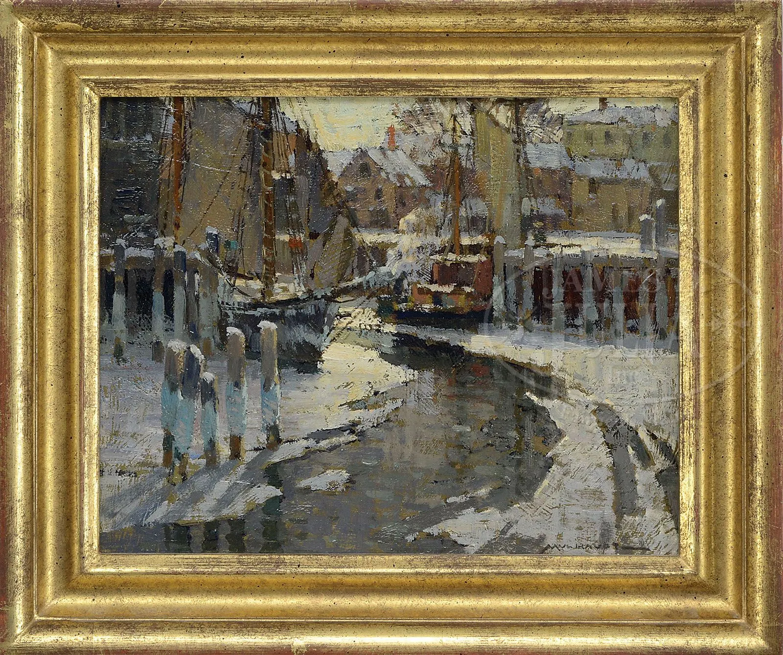 FREDERICK JOHN MULHAUPT (American, 1871-1938) “THE ICE-BREAKER’S PATH”. Oil on board Housed in a Guido 22/23 karat gold leaf frame in good condition Signed “Mulhaupt”, lower right Exhibition History: Boston Art club, exhibition of intimate pictures; North Shore Arts Association of Gloucester, 1999 SIZE: 8″ x 10″. Overall: 10-3/4″ x 12-3/4″ PROVENANCE: The John F. Gale Collection, Cambridge, MA CONDITION: Very good 9-27305 (20,000-30,000)