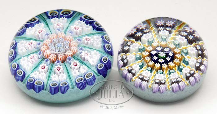 TWO PERTHSHIRE PAPERWEIGHTS. Two Perthshire paperweights with millefiori canes arranged in a radial spoke pattern. One is in colors of seafoam green, blue, white and salmon. The other is in colors of amethyst, green, yellow and blue. One is unsigned, the other is signed with a central “P”. SIZE: 2-3/4″ dia and 2-1/2″ dia respectively. CONDITION: Both are very good to excellent. 5-67352 5-67364 (200-300)