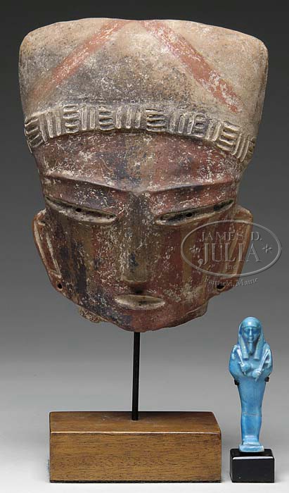 TWO PIECES OF ANTIQUITY. Including earthenware polychrome painted head, possibly pre-Columbian, and a turquoise glaze ushabti Egyptian tomb figure on stand. SIZE: Head: 9″ x 6-1/2″. Ushabti: 4″ h. PROVENANCE: From the private collection of Dorothy-Lee Jones. CONDITION: Head with old split at back of head. Holes drilled at back of top. Painted surfaces appear original and faded. Ushabti appears original with old split and repair across lower body at knees. 9-23219 (600-900)