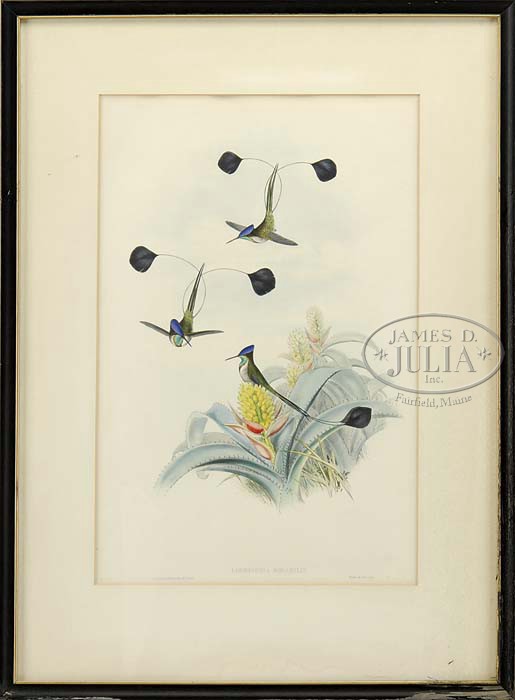 PAIR OF GOULD & RICHTER HUMMINGBIRD PRINTS. 1) “Thaumastura Enicura”. Print shows three hummingbirds on a pink flowering leafy plant. Bottom left “J. Gould & H. C. Richter Del et Lith”. Bottom right “Hullmandel & Walton, Imp”. 2) “Loddigesia Mirabilis”. Print shows three fancy hummingbirds with double tails on a yellow blossoming cactus. Bottom left “J. Gould & H. C. Richter Del et Lith”. Bottom right “Walter & Cohn, Imp”. Both identically housed in black gold edge wood frames with white mattes. SIZE: Sight: 20-1/4″ x 13-1/4″. PROVENANCE: From the private collection of Dorothy-Lee Jones. CONDITION: Not examined out of frame, some toning, generally good. 9-23240 (400-600)