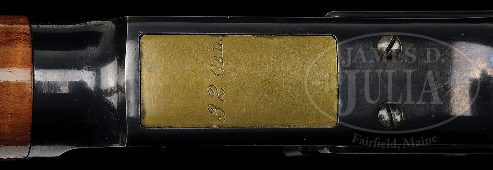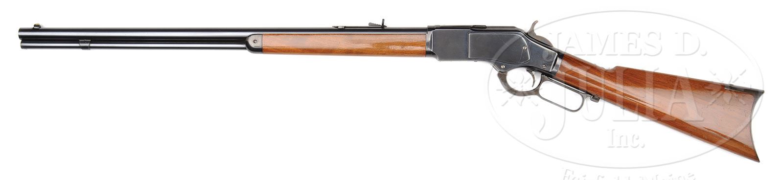 SCARCE EARLY WINCHESTER MODEL 1873 LEVER ACTION RIFLE. SN 178940. Cal. 32 WCF (32-20). Standard grade rifle with 24-1/4″ rnd bbl, full magazine, half nickel front sight and semi-buckhorn rear sight. Mounted with very nicely figured, uncheckered, slab sawed American walnut with straight stock and crescent buttplate without trap. This rifle was produced in 1885, only three years after the introduction of the 32-20 cartridge. When this small caliber cartridge was introduced, and pretty much throughout its useful life, it was considered a ladies, youngsters or varmint gun and usually was treated accordingly. They generally saw hard use by these inexperienced shooters and most often were afforded very little or no maintenance and are rarely found today with much or any orig finish. PROVENANCE: Woody Frey Collection. CONDITION: Extremely fine plus, all orig. Overall retains 99% plus crisp, bright, orig factory finish with only one small scrape on the forend cap, a couple of tiny nicks in he blue on the receiver and a few handling and storage marks on the wood. Hammer retains brilliant case colors and lever strong, bright case colors, lightly faded on the outer faces. Buttplate retains strong, bright case colors. Lever latch retains brilliant case colors. Wood is sound and retains about all of its crisp, bright piano varnish finish. Mechanics are crisp, brilliant shiny bore, probably unfired. 4-48414 JR192 (10,000-15,000)
