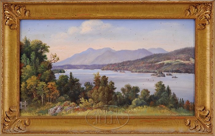 SETH STEWARD (American, 1844-1927) NORTHERN MAINE LANDSCAPE. Oil on board panoramic view showing Moosehead lake dotted with small islands having a mountain background under light blue and white cloud sky. Signed lower right “S W Steward 1921″. Housed in what appears to be its original gilt leaf decorated frame. SIZE: Sight: 12-1/2″ x 23”. CONDITION: Very good, surface fly specks and surface grime. 9-97012 (2,500-3,500)