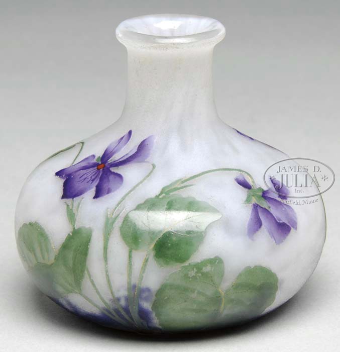 DAUM NANCY CAMEO & ENAMEL CABINET VASE. Exquisite vase of bulbous form has an extended neck and flared lip. It begins with a white mottled ground and is decorated with violets in deep purple and ends with the foliage in green with gold highlights. Signed on the side in cameo “Daum Nancy” with the Cross of Lorraine. SIZE: 2-1/4″ t x 2-3/4″ w. CONDITION: Very good to excellent. 5-62182 (2,500-3,500)