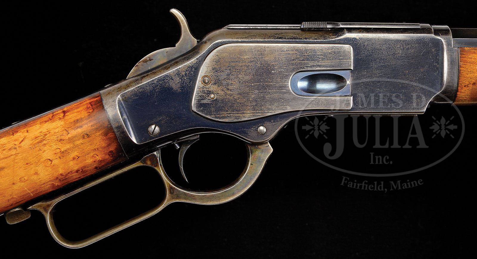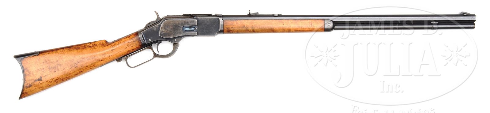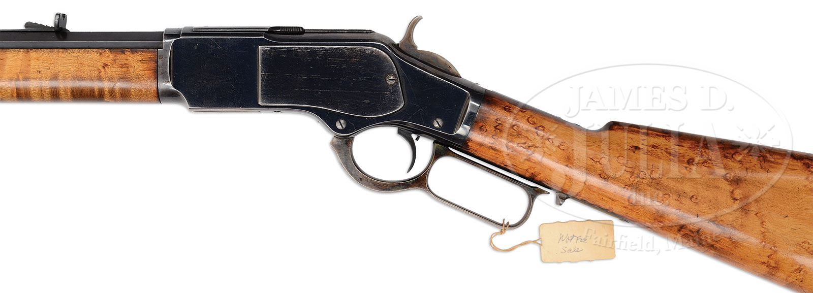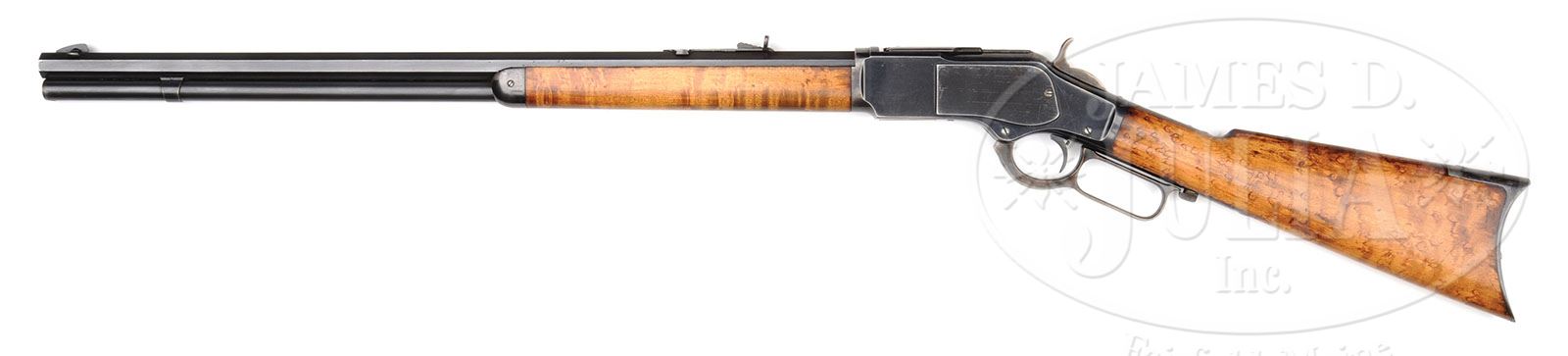 EXTREMELY RARE WINCHESTER MODEL 1873 LEVER ACTION RIFLE WITH BIRDSEYE MAPLE STOCK AND FOREARM. SN 215880. Cal. 38 WCF (38-40). Standard grade rifle with 24-1/4″ oct bbl, full magazine, Rocky Mountain front sight & semi-buckhorn rear sight. Receiver has single set trigger. Left side of the lower tang, under the wood is marked “XXX” & the assembly # 1185 along with “BM”, which presumably stands for birdseye maple. Matching assembly # is also found in the top tang channel of buttstock and inside toe of buttplate. Standard grade Model 1873 rifles are not uncommon and although exotic woods were listed as an option in Winchester catalogs they were very seldom ordered with anything other than walnut. Later models are more frequently encountered with birdseye maple but extremely few Models 1873 are known. PROVENANCE: Woody Frey Collection. CONDITION: Very fine to extremely fine. Bbl & magazine tube retain 96-98% strong orig factory blue with only faint sharp edge wear & light muzzle end wear. Forend cap retains most of it’s orig blue, slightly dulled. Receiver retains 88-90% orig blue, stronger on the left side with most of the losses on the side plates. Loading gate retains nearly all of it’s bright fire blue. Hammer retains bright case colors & the lever bright colors on the sides, more faded on the outer faces. Buttplate retains about 85% thin orig blue. Wood is sound with light oil staining on buttstock around the receiver with a very few, very light nicks & scratches and retains about all of it’s bright orig finish. Mechanics are crisp. Bright, shiny bore. 4-48418 JR166 (7,000-10,000)