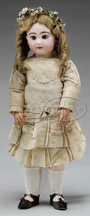 LARGE CLOSED MOUTH JUMEAU BEBE. Head is stamped in red “DEPOSE TETE JUMEAU Bte S.G.D.G. 12”. She has lovely blue paperweight eyes with thick heavy eyebrows and long painted lower lashes and pierced ears. She is on her original unmarked fully jointed French wood and composition body with fine original finish. Costume is made in the antique style with the finest quality antique cream silks and fine ecru lace. She wears a flower garland in her soft honey mohair wig and antique brown leather shoes are stamped on the soles “12” and logo of a lady “DEPOSE”. SIZE: 27″ (68cm). CONDITION: Very good. 1-10874 (3,500-4,500) Auction: Advertising, Toy & Doll - Spring 2011 Please Note: All prices include the hammer price plus the buyer’s premium, which is paid by the buyer as part of the purchase price. The prices noted here after the auction are considered unofficial and do not become official until after the 46th day. |