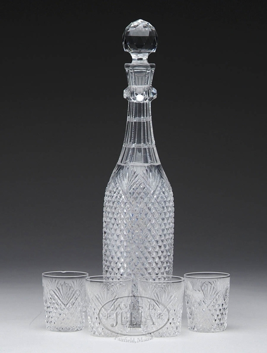 CUT GLASS WHISKEY SET. Beautiful cut glass whiskey set has strawberry diamond pattern covering the side which is topped with a fan pattern. Zipper cutting extends up the faceted six-sided neck and is topped with a faceted stopper and is accompanied by four matching whiskey tasters. SIZE: Decanter: 15-1/4″ t. Tasters: 2-3/4″ t. CONDITION: Two of the whiskey tasters have small chips to rim, otherwise very good to excellent. 9-28699 (250-350)