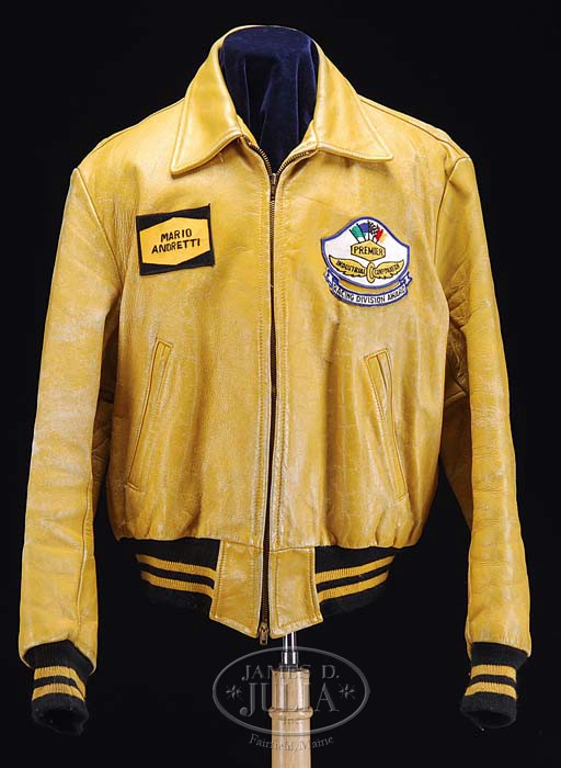 MARIO ANDRETTI WORN LEATHER SHOP JACKET. Orange leather zipper front jacket with side pockets and black and gold striped wrists and waist band. Interior lined with a light green fabric. Retaining its original Mario Andretti black and gold patch and Premier Industrial Inc. patch. A photograph of the jacket was sent to Mario Andretti and he has signed the photograph and his office has written a letter indicating he is not sure what year (1965, 1966 or 1967) he wore the jacket. The photo and letter accompany the lot. SIZE: Small. CONDITION: Shows some light wear and color loss. Generally good. 9-94094 (4,000-6,000)