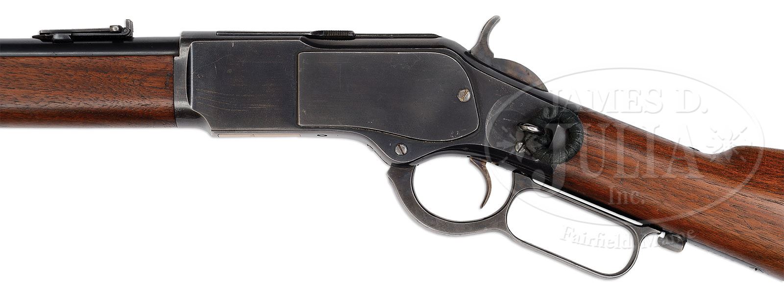 *WINCHESTER 3rd MODEL 1873 SADDLE RING CARBINE. SN 546729. Cal. 44 WCF (44-40). Standard carbine with 20″ rnd bbl, full magazine, barleycorn front sight and 900 yd ladder rear sight. Left side of the receiver has a staple and ring. Mounted with uncheckered straight grain American walnut, straight stock and carbine buttplate with trap containing an orig, all steel 3-pc cleaning rod. Saddle ring is cloth covered. This carbine was made in 1900 when the west was still pretty wide open and most business was conducted from the back of a horse or wagon. These carbines were extremely popular with folks from all walks of life and usually saw very hard service with limited maintenance and are rarely found today with any orig finish. PROVENANCE: Woody Frey Collection. CONDITION: Extremely fine. Bbl, magazine tube and bbl bands retain about 98% bright, orig factory blue with light muzzle end wear and some thinning on the high points of the bands. Receiver retains about 95% bright orig blue, thinning around the carry point, bottom of receiver, and front receiver ring with some light sharp edge wear and light candy striping. Dust cover is flaked, not worn to a light patina. Hammer retains virtually all of its orig case colors, turned a little dark, lever retains lightly faded case colors on the sides, turned silver on outer faces. Buttplate retains nearly all of its orig case colors, bright on the tang and lightly to moderately faded on the face with heel worn to silver. Wood is sound with a few light nicks & scratches and overall retains most of its orig factory oil finish. Mechanics are crisp, brilliant bright shiny bore. Cleaning rod is equally fine. 4-48412 JR191 (9,000-13,000)