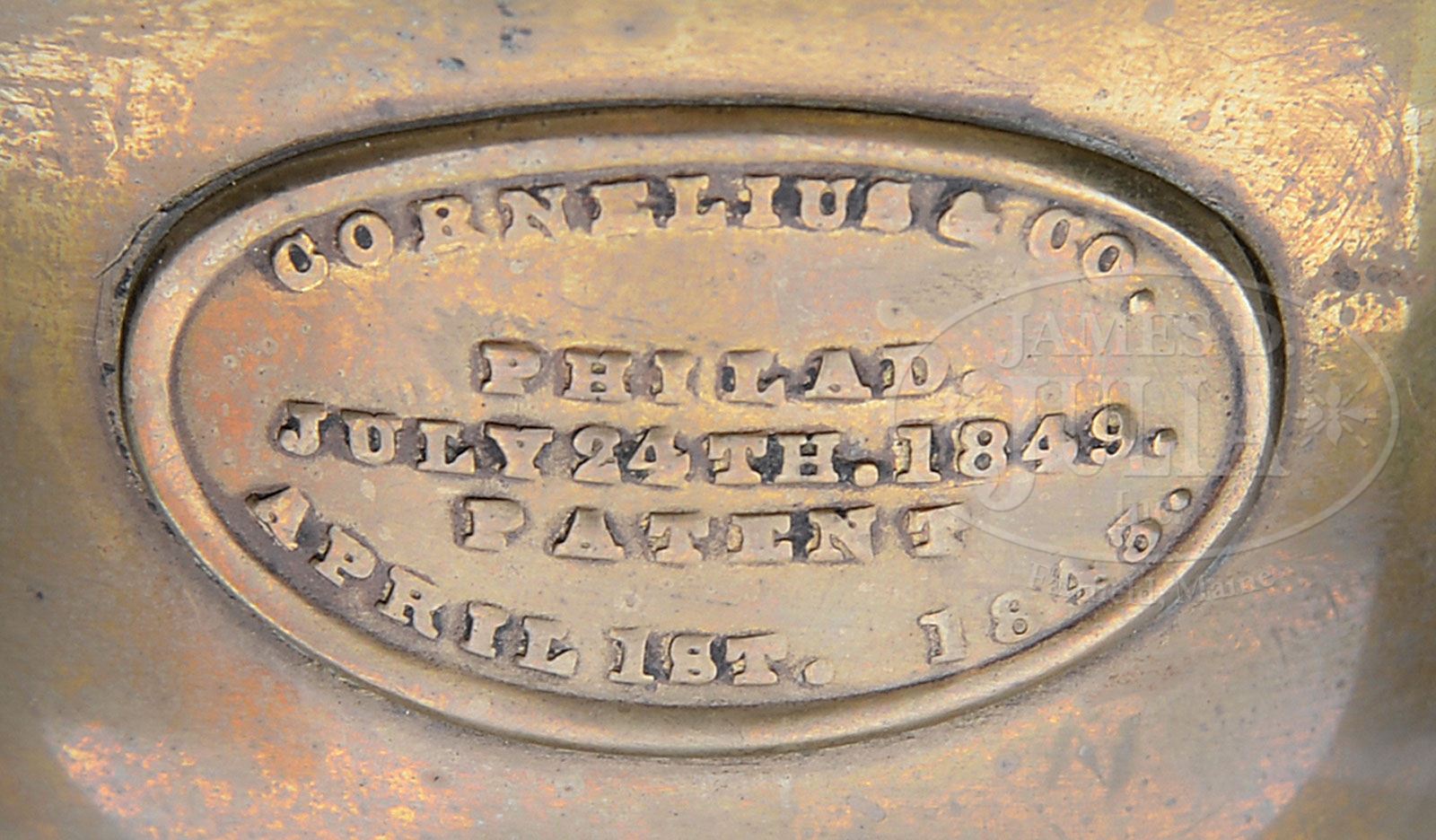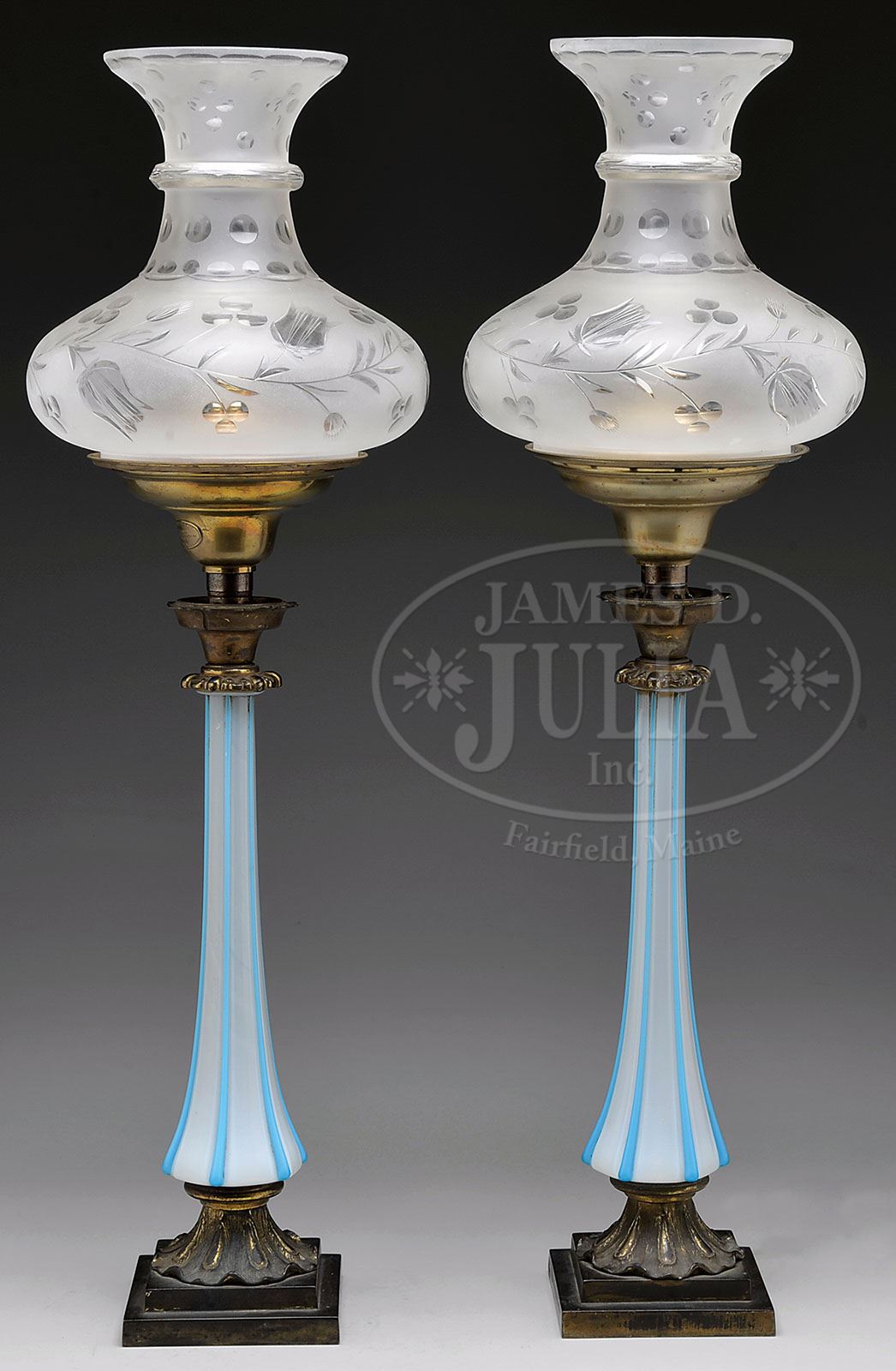 CORNELIUS & CO. SOLAR LAMPS. Pair of solar lamps have brass stepped base with a ruffled and ribbed floral shaped stem supporting a white opalescent shaft with applied light blue ribbing. The lamps are finished with a solar lamp font with applied brass tag “Cornelius & Co. Philad. July 24th. 1849 Patent April 1st. 1845”. Each of the lamps is completed with a frosted cut to clear reproduction shade. SIZE: 31″ t. CONDITION: Very good. Lamps have been electrified and drilled and have loss to gilding on base. 9-90118 (1,500-2,500)
