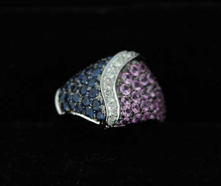 14KT PINK & BLUE SAPPHIRE RING. Wonderful 14kt white gold ring has pavee set blue sapphires down one side and pink sapphires down the other. Sapphires are separated by a curving band of diamonds. Total sapphire weight is approx. 1.10ct and diamonds are total approx. weight of .12ct. CONDITION: Very good to excellent. 5-70235 (400-600)