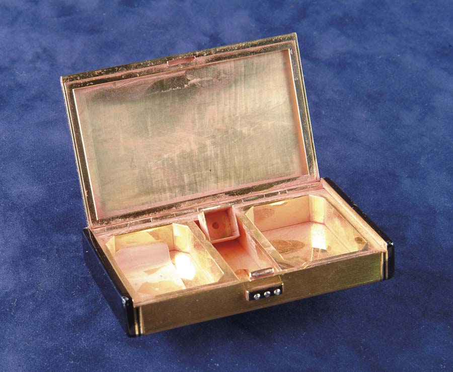 18KT COMPACT BOX BY CARTIER, PARIS. This fabulous 18kt yellow gold and black enamel compact box by Cartier, Paris is a rectangular hinged box having black enamel ends and three diamond and black enamel clasp. Lid opens to reveal an inside area of the top which has a gold frame and once probably held a mirror which is not present. The bottom interior having two cut corner powder wells and brush holder. Marked “Cartier Paris” with French hallmarks. WEIGHT: 4.9 tr oz. SIZE: 2-1/4” x 3-1/2”. CONDITION: Small chips to edges of black enamel ends, missing mirror and brush. Otherwise good. 5-70821 (2,500-3,500)