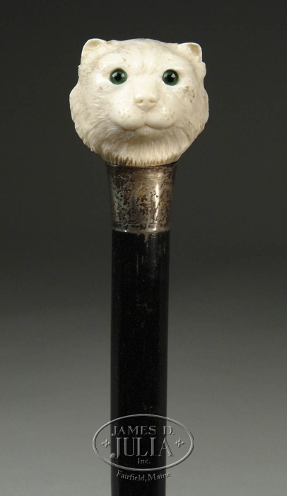 FINE CARVED IVORY CAT HEAD CANE. Nicely carved elephant ivory handle carved with a cat head having green glass eyes and carved fur. A sterling collar with London hallmarks which are worn and makers mark “HT”. Circa 1890’s. Shaft is ebonized mahogany with a 1” worn brass ferrule. SIZE: 35-1/2” l. Handle is 1-1/2” h x 1-3/4” dia. CONDITION: Carving is very good, shaft has some minor wear. 9-28188 (1400-1800)