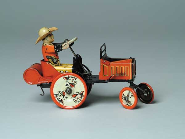 MARX COWBOY WHOOPEE CAR. Tin windup eccentric vehicle rears and spins as cowboy jumps in seat. SIZE: 8” l. CONDITION: Near excellent and working. 1-1601 (250-400) Auction: Advertising, Toy & Doll - Fall 2003 Please Note: All prices include the hammer price plus the buyer’s premium, which is paid by the buyer as part of the purchase price. The prices noted here after the auction are considered unofficial and do not become official until after the 46th day. |