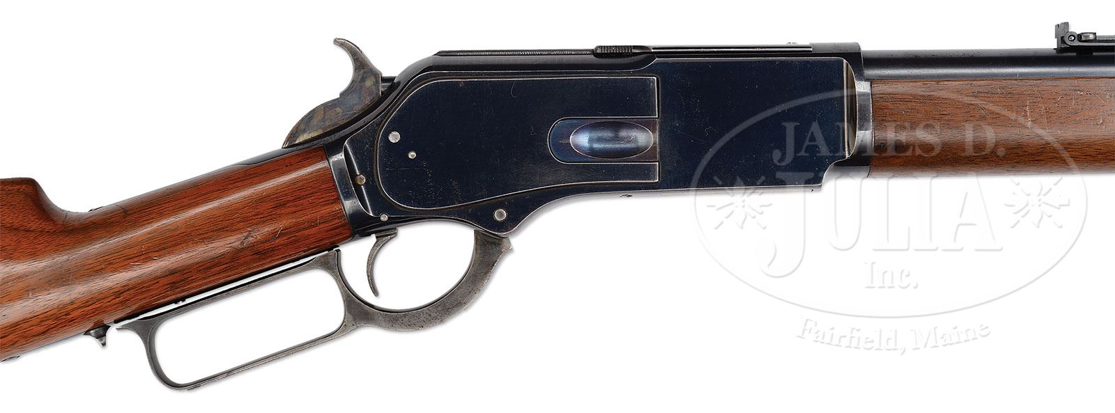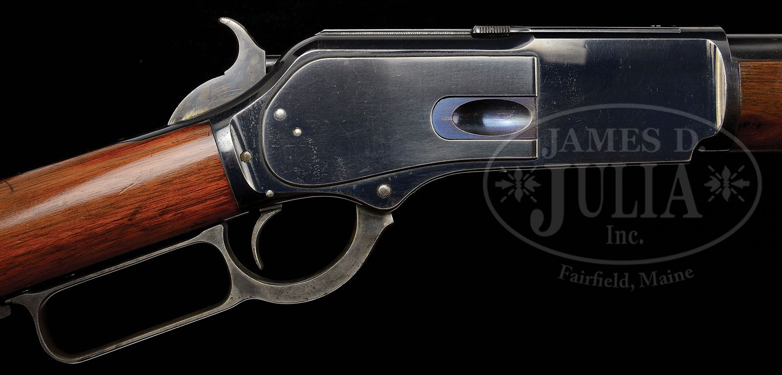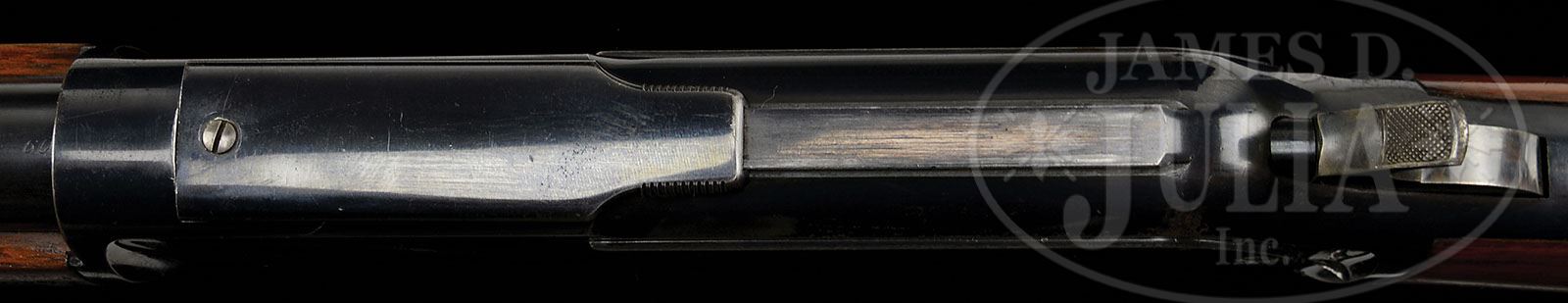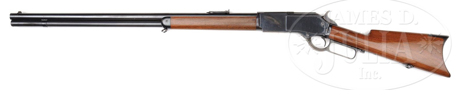 FINE WINCHESTER THIRD MODEL 1876 LEVER ACTION RIFLE. SN 52510. Cal. 45-60. Standard grade rifle with 28″ rnd bbl, full magazine, half nickel front sight & 1876 marked ladder rear sight. Mounted with very nicely figured, uncheckered, slab sawed American walnut with straight stock and crescent buttplate with trap which contains an orig 5-pc brass & iron cleaning rod. Bottom of the stock & forend cap have factory sling loops. The Model 1876 was the first powerful big bore repeating rifle brought to market & was immediately adopted by the intrepid pioneers, hunters, trappers & settlers of the west from all walks of life. It was the first rifle with a powerful cartridge sufficient for all North American big game such as moose, elk, buffalo & grizzly bear. These rifles & carbines were usually hard used & rarely are found with orig finish. PROVENANCE: Woody Frey Collection. CONDITION: Extremely fine plus. Bbl & magazine tube retain 98-99% crisp orig blue with very light muzzle edge wear, a couple of small nicks & spots of light surface etching. Receiver has a small streak of cleaned, very fine pitting on the left front side panel otherwise receiver and side plates retain nearly all of their bright, high polished factory blue. Dust cover retains about 96% glossy orig blue. Lever & hammer retain brilliant case colors, faded on outer faces of lever. Buttplate retain most of its strong orig blue, worn bright on heel & toe. Wood is sound with a few light nicks & scratches and retains about all of its brilliant, orig factory finish on the buttstock, turned dull on the carry point. Altogether an extremely beautiful ’76. Mechanics are crisp. Brilliant, shiny bore, may be unfired. Cleaning rod is fine. 4-48421 JR173 (8,000-12,000)