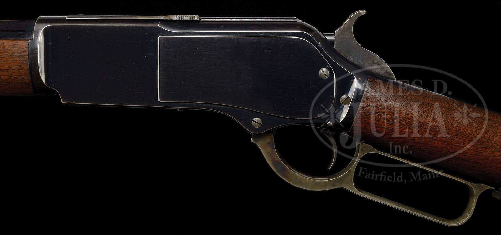 EARLY WINCHESTER THIRD MODEL 1876 LEVER ACTION RIFLE. SN 33924. Cal. 45-75. Standard grade rifle with 28″ oct bbl, full magazine, half nickel front sight & 1876 marked ladder rear sight. Mounted with uncheckered, straight grain American walnut with straight stock & crescent buttplate with trap. This rifle was produced in 1883 during the Great Westward Expansion of Manifest Destiny when repeating firearms were in tremendous demand. The 1876 was the first repeating, powerful big bore rifle sufficient for all North American big game such as moose, elk, buffalo & grizzly bear & saw service throughout the American west, Northwest Territories, Alaska & the deep woods throughout North America. They usually saw very hard service usually under extreme adverse conditions and are rarely found with high orig finish. PROVENANCE: Woody Frey Collection. CONDITION: Very fine to extremely fine. Bbl retains 96-97% strong orig blue with light sharp edge wear. Magazine tube & forend cap retain strong blue in sheltered areas, turning a little plum over the outer surfaces. Receiver & side plates retain 95-96% glossy orig blue with light sharp edge wear & a couple very minor scratches. Dust cover retains about 75% orig blue with the balance flaked to a light patina. Hammer retains about all of it’s orig case colors, lightly to moderately faded. Lever retains strong case colors on sides and sheltered areas, faded to silver on outer faces. Buttplate retains 65-75% orig blue worn to gray metal on heel & toe. Wood is sound with a few very light nicks & scratches. Buttstock retains most of it’s bright orig finish and the forearm is a hand worn patina. Mechanics are crisp. Bright, shiny bore. 4-48429 JR174 (6,000-9,000)