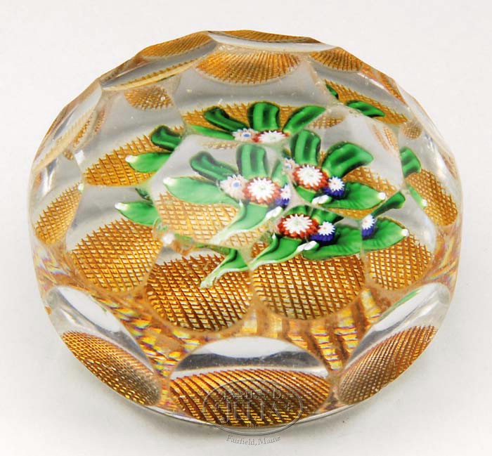 ST. LOUIS NOSEGAY PAPERWEIGHT. Five green leaves support three millefiori florets in colors of red, white and blue. Design rests on an amber crosshatched ground and has allover multiple facets. SIZE: 2″ dia. CONDITION: Extensive chips and roughness to allover facets. 5-67389 (200-300)