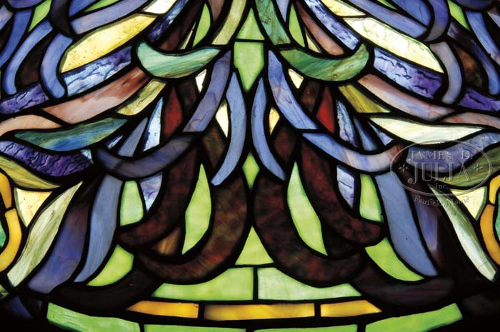 DUFFNER & KIMBERLY PEACOCK TABLE LAMP. Intricately design, fully leaded shade depicts peacock feathers with eyes in full plumage. Colors used in these feathers are deep blues and purples. Some of the glass is heavily textured while other pieces are more plain and simple. The eyes of the feathers have an outline of yellow glass which encircles green glass and ends with deep purple as the eyes. All of this is set on a heavily textured ground in colors of green and amber. This conical shade is finished with an irregular border. Representing the epitome of the art nouveau period, this shade flows from one color to another beautifully. Shade is supported by an original Duffner & Kimberly four socket base with vertical ribbing extending down to the circular foot. The vertical ribbing is reminiscent of feathers and complements the shade perfectly. Base is completed with four acorn pull chains, sockets, a heart pierced bell housing, matching top cap and finial. The entire lamp carries a desirable patina finish. This lamp may be further referenced in the book Mosaic Shades Vol. II by Paul Crist, page 183. The lamp is accompanied by a letter of authenticity from Paul Crist Studios. SIZE: Shade is 22″ dia. Lamp is 27″ t. CONDITION: Very good to excellent with very few if any tight hairlines on shade. Base has one loose socket. 5-62186 (45,000-55,000)