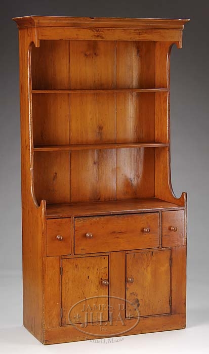 EARLY AMERICAN MAINE PINE PEWTER CUPBOARD. Early 19th Century. Cove molded cornice above rectangular case projecting over two open shelves. Base fitted with a long drawer flanked by short drawers above a pair of cupboard doors, all with turned wooden knobs on a plinth base. SIZE: 76-1/2″ h x 37″ w x 19″ d. CONDITION: Very good overall with old cleaned surfaces with some acceptable staining on top of lower cabinet including some water rings. No evidence of any repairs or restoration. Original backboards. 9-91548 (3,500-5,000)