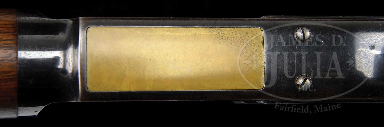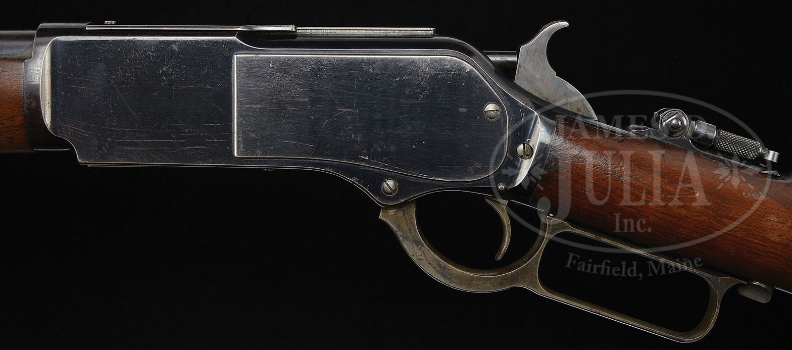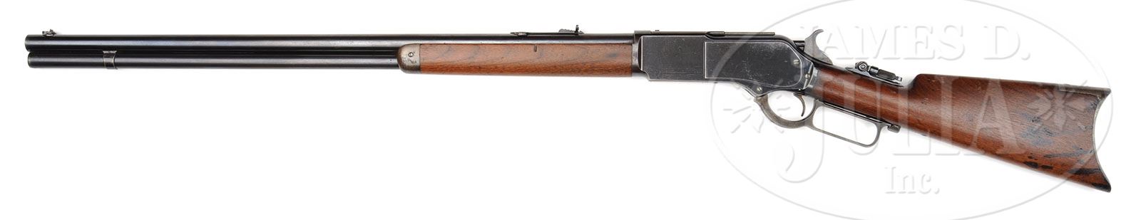 WINCHESTER SECOND MODEL 1876 LEVER ACTION RIFLE. SN 6831. Cal. 45-75. Standard grade rifle with 28″ rnd bbl, full magazine, ivory bead Beach’s combination front sight, flat top rear sight & Lyman combination tang sight. Receiver is 2nd type with screwed-on dust cover rail and 2nd type dust cover with impressed thumbprint. Mounted with uncheckered, straight grain American walnut, straight stock & crescent buttplate with trap containing a 4-pc brass & steel cleaning rod, missing the section with slotted tip. Instead it has a brass slotted tip with threads to match the female ends of the rods. This rifle was produced in 1878 at the height of the Great Westward Expansion of Manifest Destiny & likely would have served on the American frontier or other far away outposts such as the Northwest Territories or Alaska. These rifles in this caliber were also very popular in the deep woods of North America. The Model 1876 was the first powerful big bore rifles on the American market & were in great demand until supplanted by more modern cartridges in the late 1800’s. PROVENANCE: Woody Frey Collection. CONDITION: Extremely fine. Bbl & magazine tube retain 95-97% strong orig blue with very minor muzzle edge wear and some light thinning over forearm area. Receiver retains about 95% glossy orig blue with sharp edge wear, some minor candy striping & a few tiny freckles of surface etching. Dust cover retains about 95% orig blue. Hammer retains faded case colors with faded colors on sides of the lever, turned to silver on outer faces. Buttplate retains smoky case colors, mostly turned silver with fine pitting on the heel and toe. Wood is sound with a series of small nicks on left side of buttstock, some dark discoloration on left side toward the heel, a couple small streaks of dark staining on right side of the comb & overall retains most of it’s orig oil finish. Forearm has a couple small bruises & a large one on the left side and retains a hand worn patina. Mechanics are crisp. Very bright, shiny bore, may have fired but if so, very little. 4-48420 JR172 (6,000-10,000)