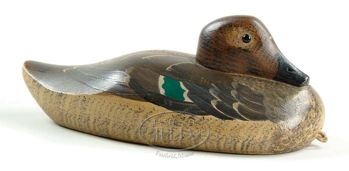 WONDERFUL ANTIQUE SLEEPING PINTAIL DECOY. By Johnson. Very nicely hand carved sleeping pintail decoy with strong, original paint decoration. Done in the early part of the 20th Century during the classic era of decoys. SIZE: 11-1/2” l x 5-1/2” w. CONDITION: Very good to excellent. A fine example. 9-90634 (1,200-1,800)