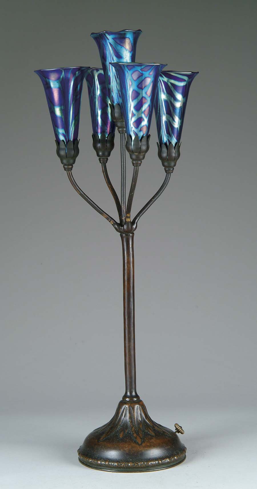 FIVE ARM LILY LAMP. Early Tiffany base has stylized leaf design at the bottom with riser supporting four outstretched arms encircling a center arm. All topped with decorated blue iridescent Lundberg shades. Each shade has a brilliant green/gold iridescent interior. Shades are signed “Lundberg 82” and base is marked “Tiffany Studios New York S1133” and a “6” underneath. SIZE: Overall height is 23 in. CONDITION: Wear to patina on base and sockets are replacements. Estate of Jon Heiden & Donald Mooers 5-60673 (1,000-2,000)