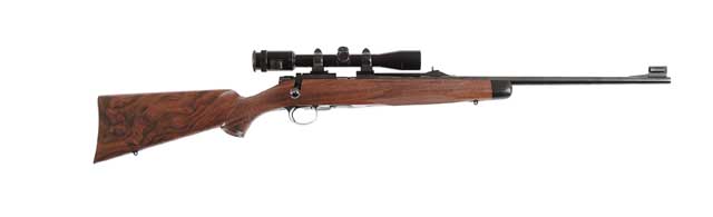 *KIMBER MODEL 82 SUPER AMERICA BOLT ACTION RIFLE. Cal. 22LR. Beautiful, high quality adult sized rifle with 22” tapered round bbl, quarter rib with 2-leaf express sight and ramp front sight, original hood. The receiver is mounted with quick detachable Kimber rings containing a Jason 3-9X scope. Mounted in a fine burled walnut half-stock with black foreend tip, checkered pistol grip with cheek-piece and checkered steel buttplate. Stock and forearm are fitted with Kimber sling swivel bases. Built by the original Kimber Co. in Clackamas, OR. SN SA316B. CONDITION: As new, retains virtually its original finish to both metal and wood. Optics are fine. 4-48451 JR331 (Dr. Ladd Heldenbrand Est.) (1,250-1,750)