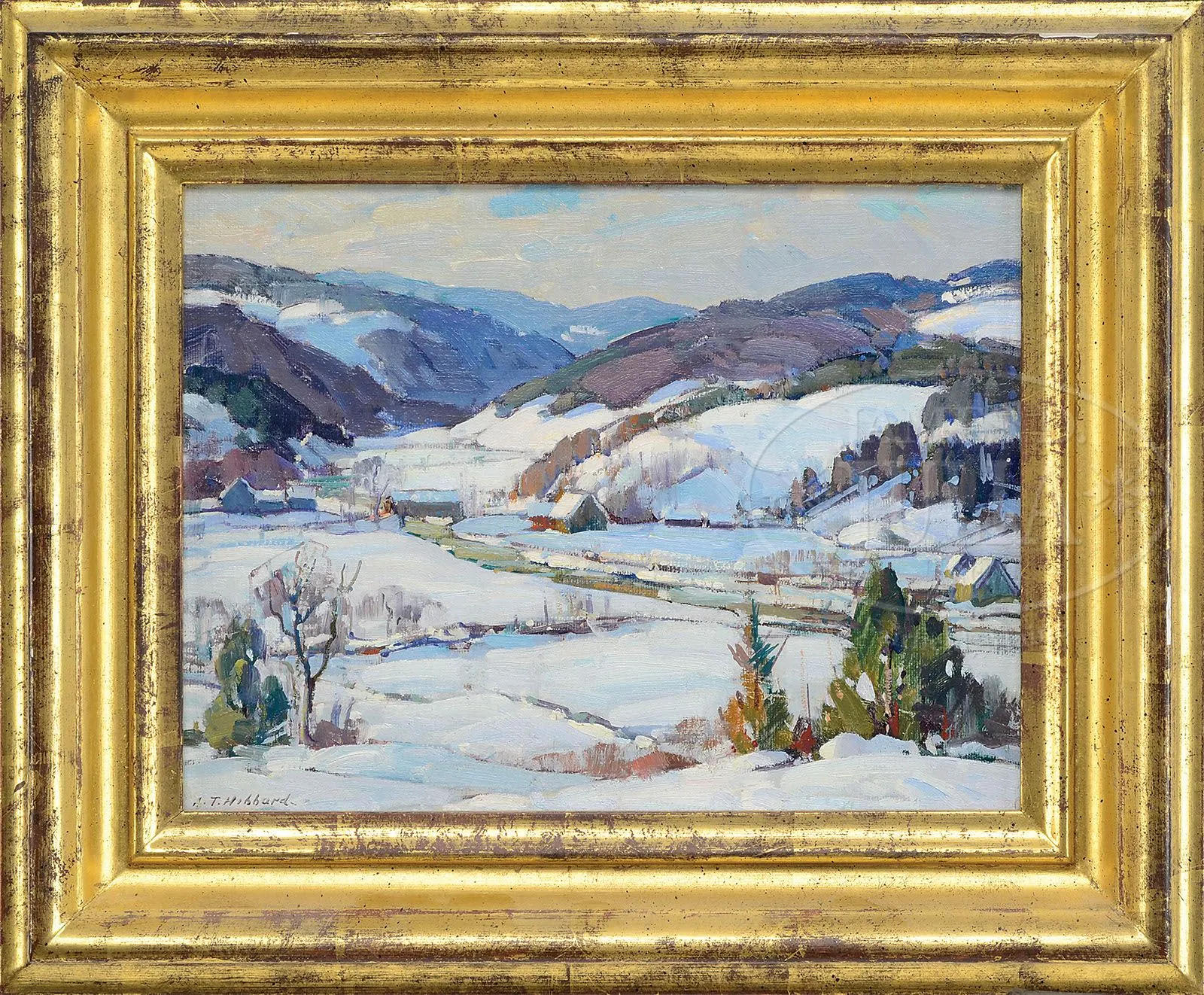 ALDRO THOMPSON HIBBARD (American, 1886-1972) VERMONT VALLEY IN WINTER. Oil on canvas laid to board Housed in a gilt molded wood Guido frame in good condition Signed “A.T. Hibbard”, lower left SIZE: 9″ x 12″, Overall: 14″ x 17″ PROVENANCE: The John F. Gale Collection, Cambridge, MA CONDITION: Two small surface chips, otherwise very good 9-27302 (3,500-5,500)