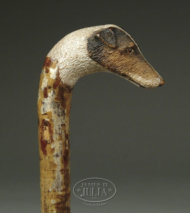 CARVED AND PAINTED WOOD DOG CANE. Foxhound type dog is an extension of the shaft and has glass eyes, pointed nose and painted fur in black, brown and white. 1” metal ferrule with iron tip. The mottled wood shaft has a varnished finish which is peeling. SIZE: 37-3/4”. Carving is 2-1/2” w x 1-1/4” h. CONDITION: Very good. 9-28168 (800-1200)
