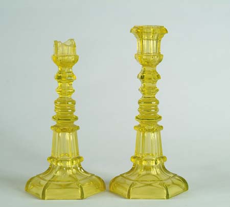 PAIR TALL CANARY HEXAGONAL CANDLESTICKS. Circa 1840-1860. This pair was taken out of building in 1927 (Sandwich Glass Works). PROVENANCE: Ex-Barlow Collection. SIZE: 11” h. CONDITION: One has part of socket re-glued, chip to underside of base, other socket missing. 9-96813 (50-100)