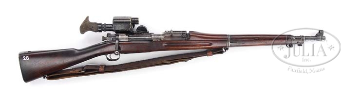 *SPRINGFIELD MODEL 1903/1908 SNIPER RIFLE. SN 342135. Cal. 30-06. 24″ bbl. This 1903 Springfield sniper rifle, manufactured in May of 1908, retains a Warner & Swasey Model 1908 (First Model) telescopic sight. The outfit shows to be in orig, fairly well used condition, with the exception of the scope base being a possible replacement. These early sniper rifles generally show significant use as they were used heavily in the trenches of France. Rifle is equipped with a period, leather sling and front sight hood as well as having the orig one bolt stock, which came into use right at this point in production. Equipped with a leather scope case of the period. PROVENANCE: Carl Metz Collection. CONDITION: Receiver shows a pleasing mixture of bright and brown patina with the case colors being well faded. Bolt shows approx 75% of a thinning blue turning to brown. Bbl assembly shows approx 85-90% of the orig blue turning plum. Bbl bands also show approx 85% orig blue turning plum, as does the triggerguard and floor plate. Smooth buttplate shows approx 50% finish with the balance turning to brown. The high hump, top handguard shows very good with only light scuffing present. The one bolt buttstock shows good with mostly light scuffs, with a small gouge directly in front of the scope mount, presumably from taking the scope on and off, and a heavy scratch on the wrist. Stock also has a small chip, approx 1’/2″ directly in front of the buttplate tang. Cartouche is present, but very faint and barely legible. Leather sling is in very good condition showing age, but with no dryness or tears. Telescope shows approx 75% of black enamel paint with spotty optics and a present, but very dry eyepiece. Scope case shows very good condition. Mechanics are good and bore is slightly bright, though well worn. 4-38434 BEK24 (2,500-4,000)