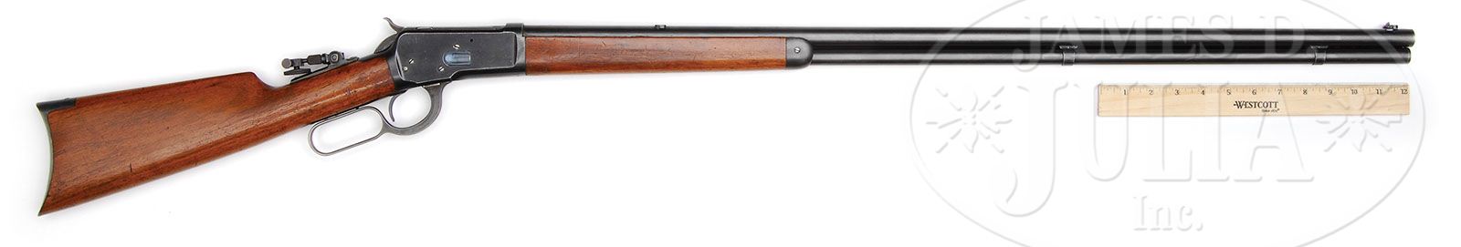 *VERY RARE EXTRA LONG SPECIAL ORDER WINCHESTER MODEL 1892 LEVER ACTION RIFLE. SN 446142. Cal. 44 WCF (44-40). Standard grade rifle with extremely rare 34″ rnd bbl, full magazine with two bands, combination front sight, slot blank in the rear seat and a tang sight with windage. Mounted with uncheckered straight grain American walnut with straight stock and crescent buttplate. Winchesters with extra length bbls are occasionally encountered, however those with 32″ and 34″ bbls are extraordinarily rare and are almost never found with high orig finish. PROVENANCE: Wes Adams Estate Collection. CONDITION: Very fine to extremely fine. Bbl retains 95-96% strong orig blue, thinning over the chamber area; magazine tube retains about 97-98% strong blue with a couple of small thinned areas; receiver retains 96-97% strong orig blue with sharp edge wear and a few light scratches; hammer retains about 75% bright case colors and the lever strong case colors on sides, faded to silver on outer faces; buttplate retains about all of its orig case colors, turned a little dark. Wood is sound with a few light handling & use nicks & scratches with the buttstock retaining 93-95% orig varnish and the forearm about 90% orig varnish. Mechanics are crisp, brilliant shiny bore. 4-44605 JR50 (12,500-17,500)